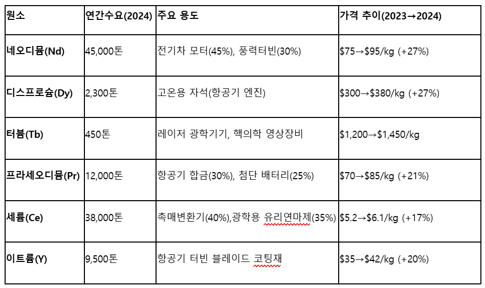 2024년 생산쿼터 조정으로 21% 회복세에 있으며, 터븀은 의료장비 수요 증가로 최고가 경신 중입니다.