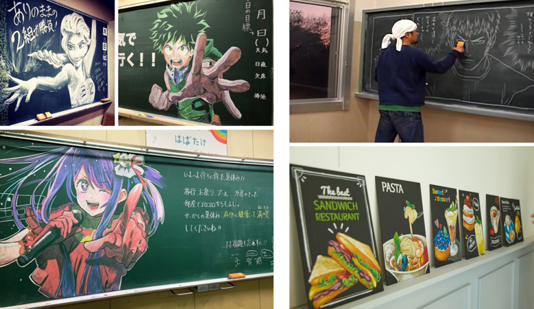 칠판에 그리는 기법이 낯설게 느껴질 수도 있지만 가깝게는 슬램덩크의 다케히코 이노우에 작가가 ‘슬램덩크 그로부터 10일 후’란 짧은 작품을 칠판에 그린 적도 있으며 카페의 메뉴판서도 볼 수 있듯 지금도 쉽게 찾아볼 수 있습니다.