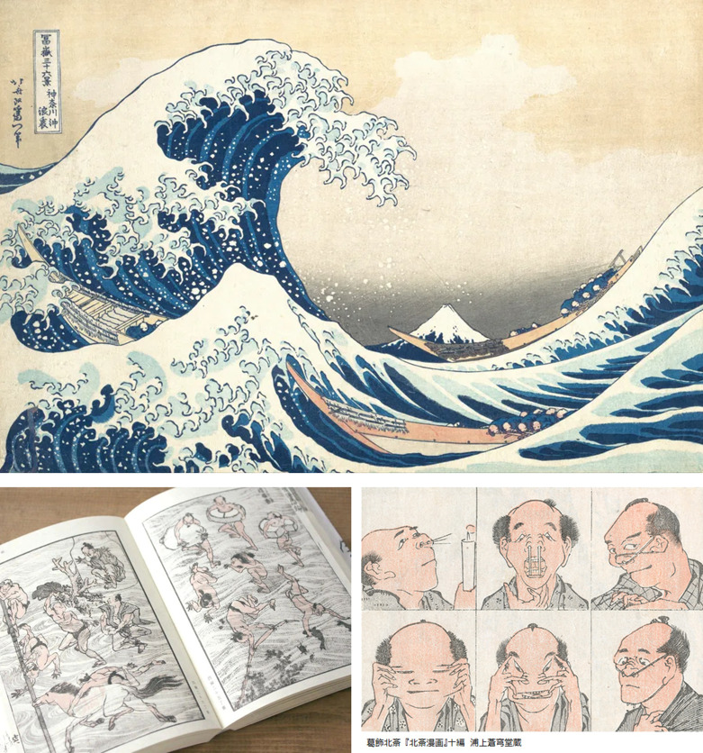 호쿠사이는 1814년에 풍경, 동물, 사람을 비롯한 다양한 주제의 스케치 모음이 포함된 '호쿠사이 만화(北斎漫画)’라는 일련의 그림책을 출판했는데, 비록 이것들이 현대적인 의미의 '만화'는 아니었지만, 현대의 만화와 견주어도 부족함이 없을 만큼 잘 그려진 그림첩이었습니다.