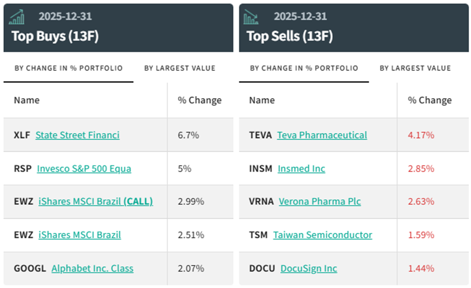 가장 주목할 변화는 세 가지 ETF의 대규모 신규 편입입니다. 첫째, XLF(금융 섹터 ETF)에 549만 주, 약 3억 100만 달러를 투입해 포트폴리오 2위로 올렸습니다. 둘째, RSP(S&P 500 동일가중 ETF)에 117만 주, 약 2억 2,500만 달러를 배치했습니다. 셋째, EWZ(브라질 ETF)에 주식과 콜옵션을 합쳐 총 약 2억 4,700만 달러를 넣었습니다. 이 세 ETF만 합치면 약 7억 7,000만 달러, 포트폴리오의 17% 이상입니다.