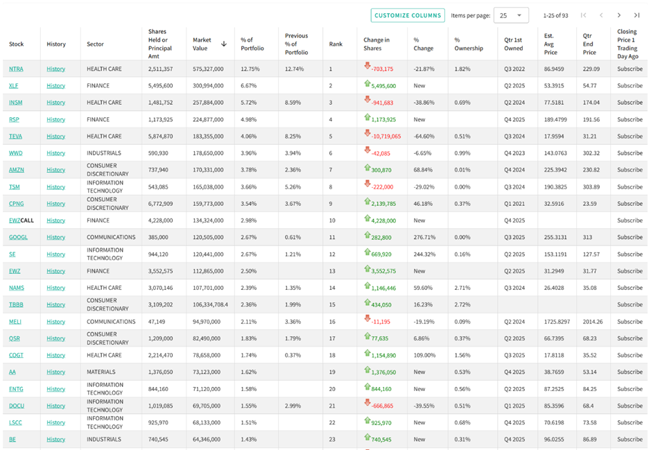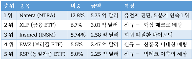 상위 5개 종목을 표로 정리하면 다음과 같습니다. 1위는 5분기 연속으로 유전자 진단 기업 나테라(NTRA)가 12.8%인 5.75억 달러로 차지하고 있으며, 2위가 이번에 신규 편입된 XLF 6.7%인 3.01억 달러, 3위 희귀 폐질환 치료제 기업 인스메드(INSM) 5.74%인 2.58억 달러, 4위 브라질 ETF인 EWZ 5.5%인 2.47억 달러, 5위 동일가중 ETF RSP가 5.0%인 2.25억 달러입니다. 상위 10개 종목이 전체의 52.29%를 차지합니다.
