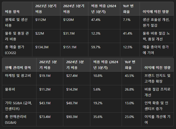 물류 및 품질 관리 비용 최적화: 물류 비용 절감 조치와 더불어 품질 관리 비용이 개선되어 매출 원가에서 절감 효과를 가져왔습니다. 이를 통해 매출 총이익이 전년 대비 7.4%p 상승하여 40.4%에 도달하였습니다.