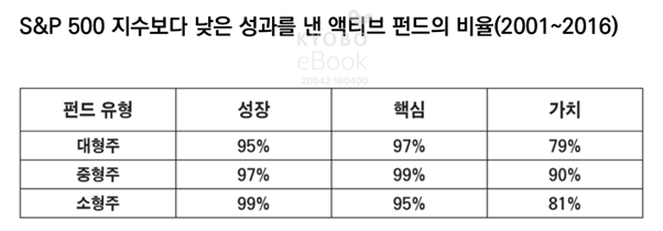 (표) S&P 500 지수보다 낮은 성과를 낸 액티브 펀드의 비율 (2001~2016) – 홍진채, 『거인의 어깨』 참고 (존 보글, 『모든 주식의 소유하라』 자료 3.3)