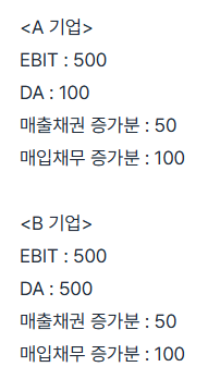 A, B 기업의 EBITDA와 OCF를 비교하면 다음과 같습니다.