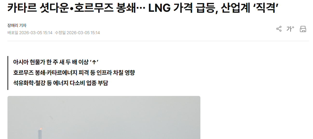 이란 분쟁이 발발한 지 한 달이 지난 지금, 비전투국 중 한국보다 더 큰 타격을 입은 국가는 없습니다. 한국 원유 수입의 70%가 통과하는 요충지인 호르무즈 해협이 사실상 봉쇄되면서 에너지, 석유화학, 반도체 및 거시경제 전반에 걸쳐 심각한 취약성이 드러났습니다. 코스피는 43년 역사상 최악의 하루 낙폭을 기록했습니다. 원화 가치는 17년 만에 최저치로 떨어졌습니다. 총 26척의 한국 국적 선박이 페르시아만에 발이 묶여 있습니다. 또한 정부의 전략 비축유는 이제 실제 소비량의 26일 치를 충당할 수 있는 수준에 불과할 수 있습니다. 경제협력개발기구(OECD)는 한국의 성장률 전망치를 주요 경제국 중 가장 큰 폭인 0.4%포인트 하향 조정했고, 물가 상승률 전망치를 2.7%로 상향 조정했습니다. 앞으로 2개월에서 6개월 동안 운송, 물류, 석유화학, 농업, 식음료 부문에 인플레이션 가격 파급 효과가 닥칠 것으로 예상됩니다. 정부 관계자들은 고물가, 고금리, 원화 약세라는 한국 경제의 3중 충격을 경고하고 있습니다.
