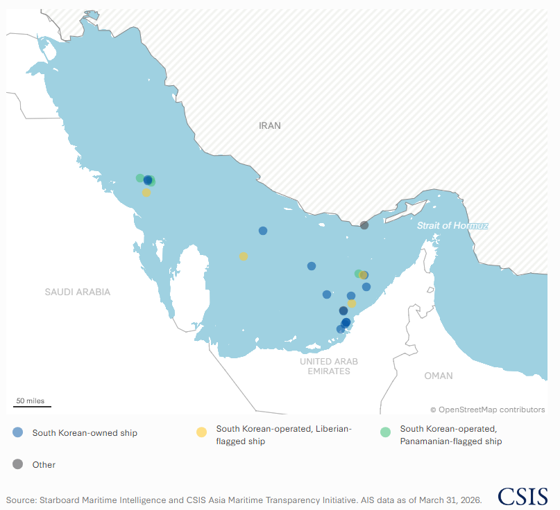 CSIS는 호르무즈 해협에 고립된 26척의 한국 소유 또는 운영 선박 중 23척을 식별했습니다. 이 선대의 구성은 한국 무역 노출의 전 범위를 ...