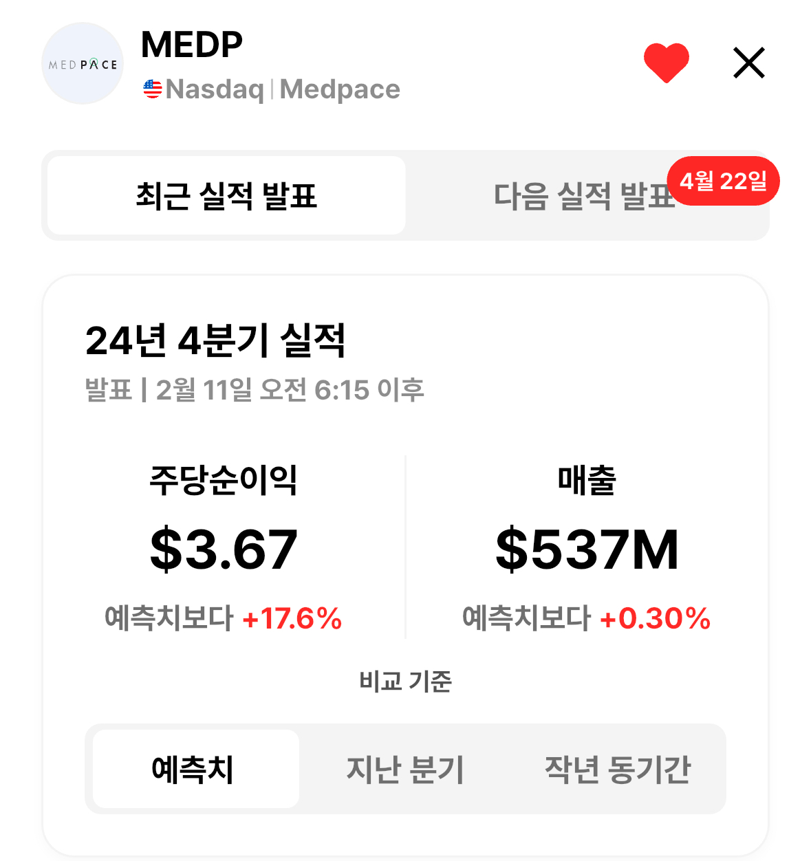 일단 필자는 MEDP를 약 3~4개월정도? 보유하고 있다가 어닝 직전에 매도함