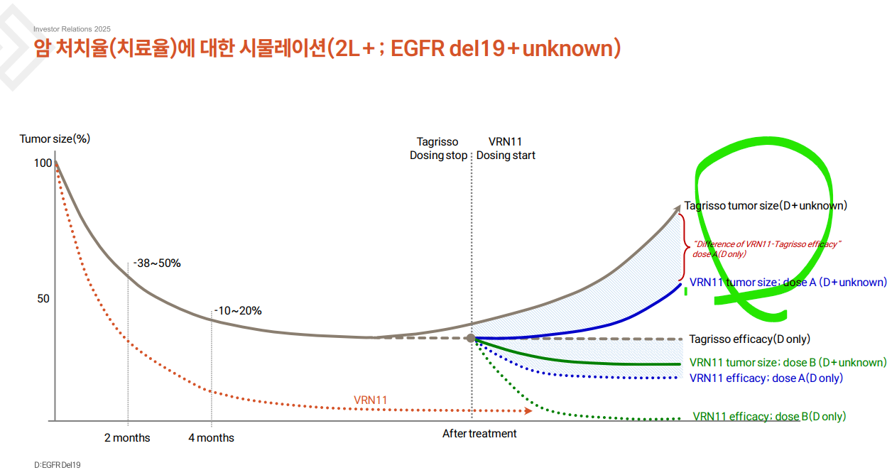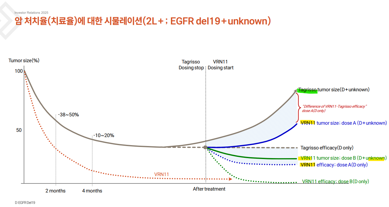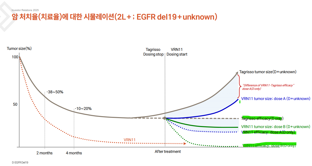 우선 VRN11은 기존의 비소세포암 치료제인 타그리소 처방 후, 경과가 나아지지 않는 '타그리소 내성 환자들' 치료를 타깃하는 2차 치료제(이하 2L)입니다.
