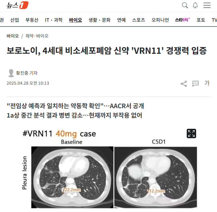 많이 기대하던 보로노의 VRN 11(비소세포암 2차 치료제) 임상 결과가 나왔습니다.