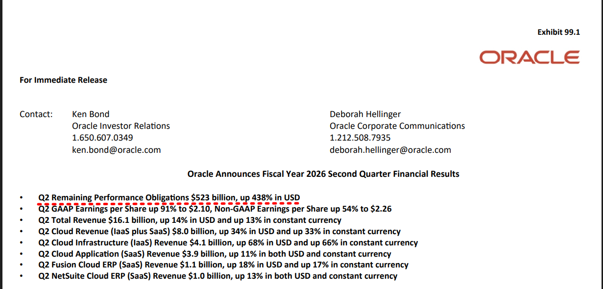 오라클은 2025년 12월 10일 실적/공시 커뮤니케이션에서 RPO가 5230억 달러로 늘었고 전년 대비 증가율이 438%라고 언급했음.