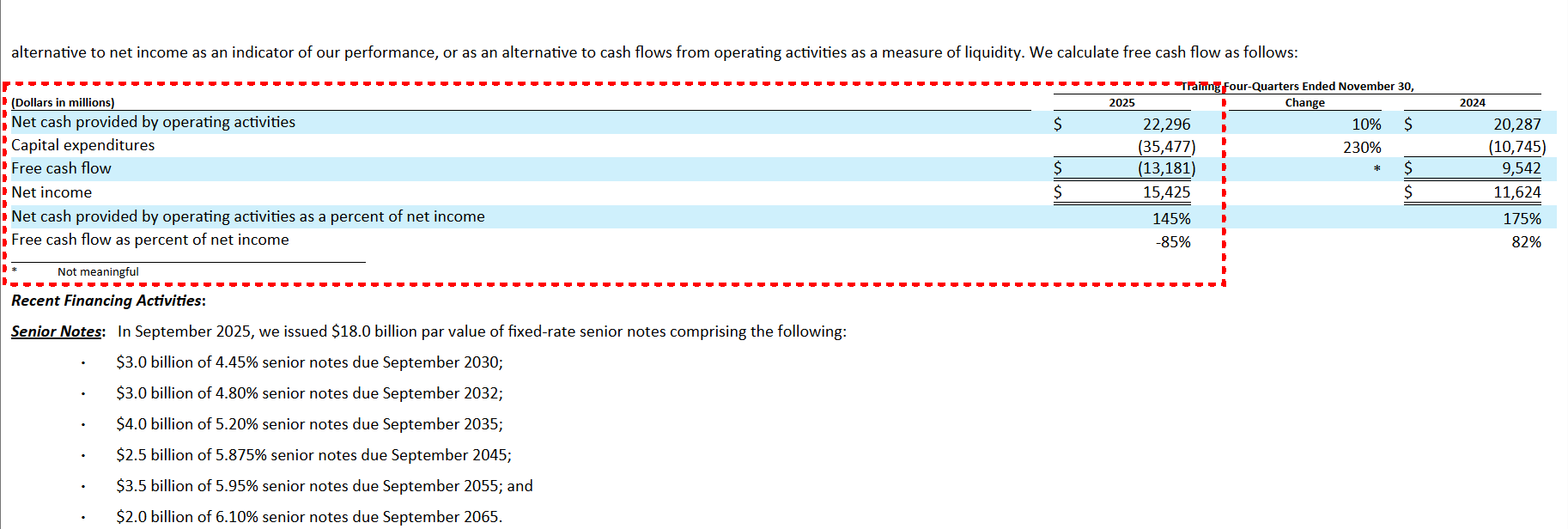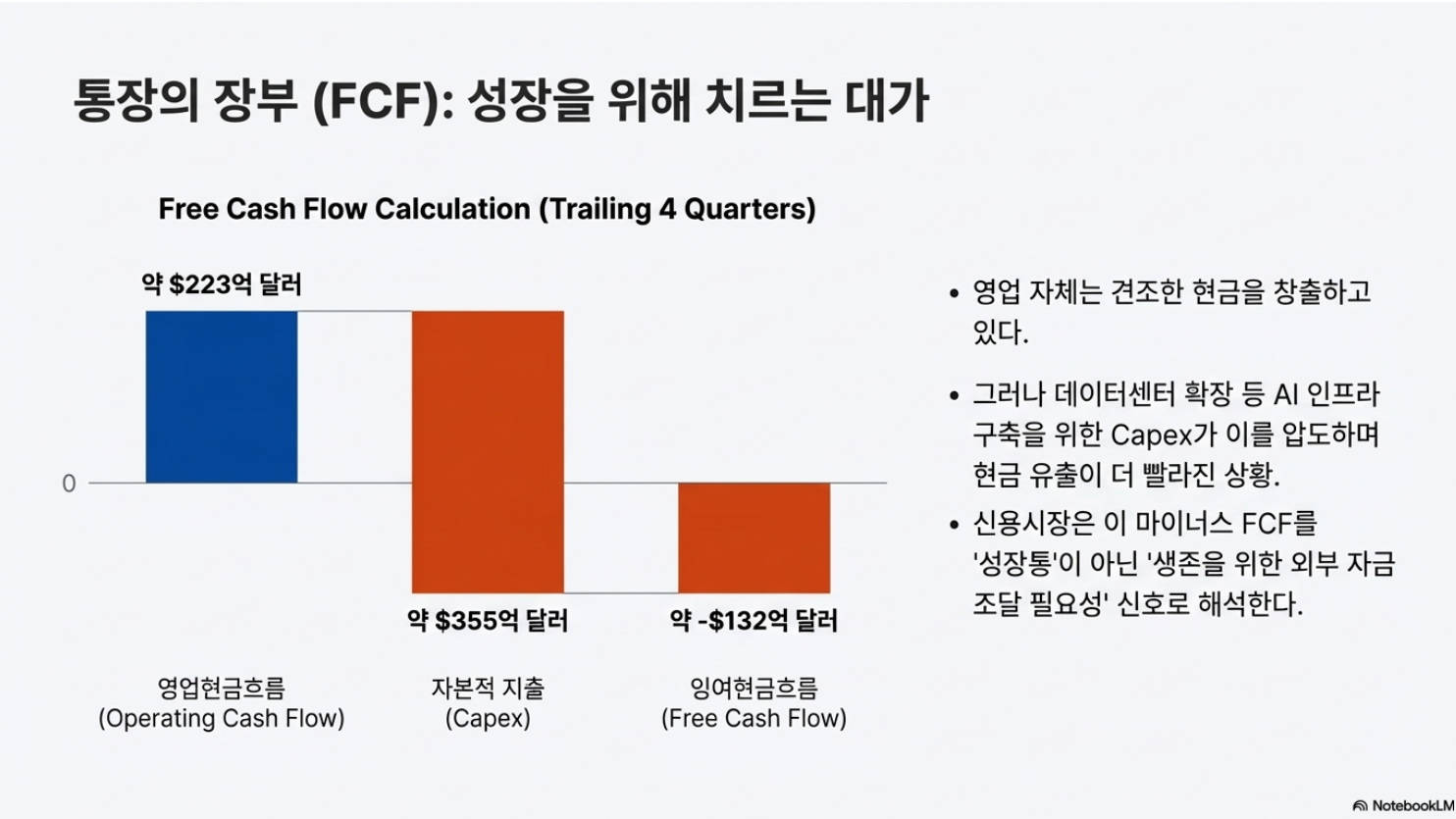하지만 인프라 국면에서는 영업현금흐름이 플러스여도 Capex가 더 크면 FCF는 마이너스 됨. 오라클이 딱 그 그림임.