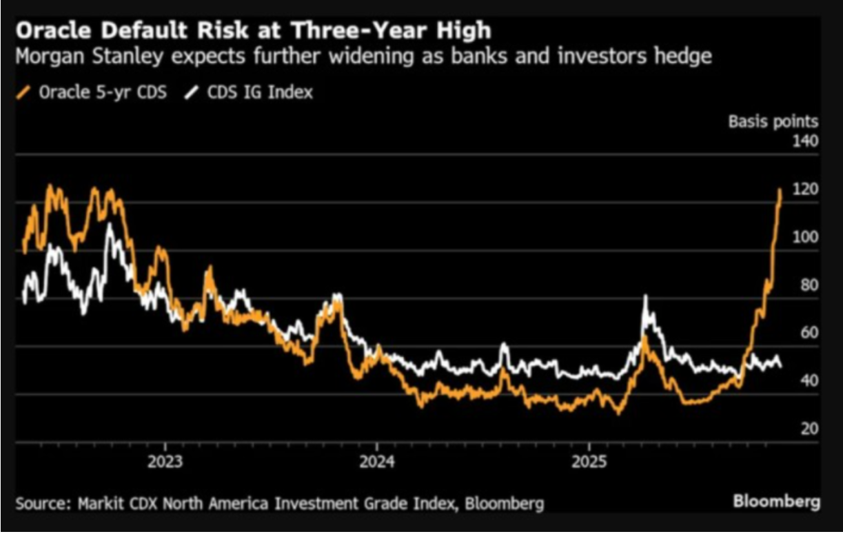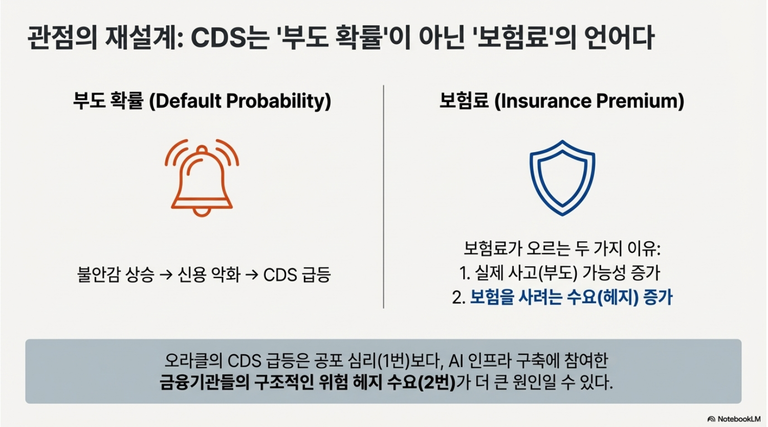 그래서 CDS가 오르면 “부도확률 급등”으로 단정하기보다, 먼저 “보험료 비싸졌음”으로 번역해야 함. 오라클의 경우 2025년 12월 11일 보도에서 5년물 CDS가 139bp 근처로 뛰었다고 정리됐고, 이것 자체가 시장에서 “보험료가 올라가는 행동”이 관찰됐다는 뜻임.