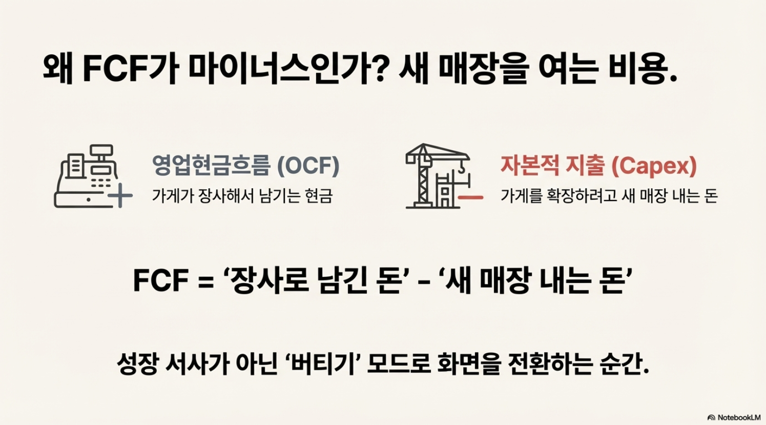 새 매장 여러 개를 한 번에 내면, 장사가 아무리 잘돼도 FCF는 마이너스 나올 수 있음. 대신 미래엔 더 벌 수도 있음.