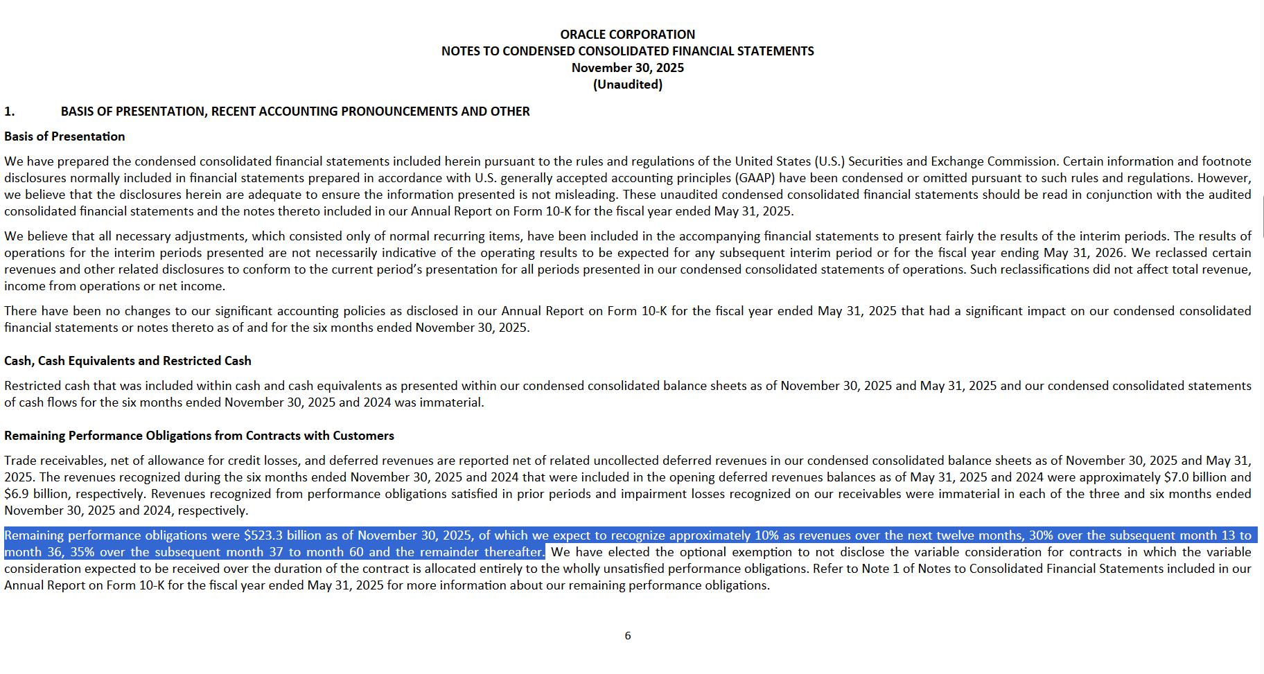 RPO가 큰 것보다, RPO가 언제 매출로 인식될지가 중요함. 오라클 10-Q에는 RPO를 시간 구간으로 나눠 “향후 12개월 내 얼마, 13~36개월 얼마…” 같은 식으로 분산 정보를 제공함. 여기서 핵심은 “전체 RPO 중 향후 12개월 내 매출 인식 예상 비중이 약 10%”로 기재돼 있다는 점임.