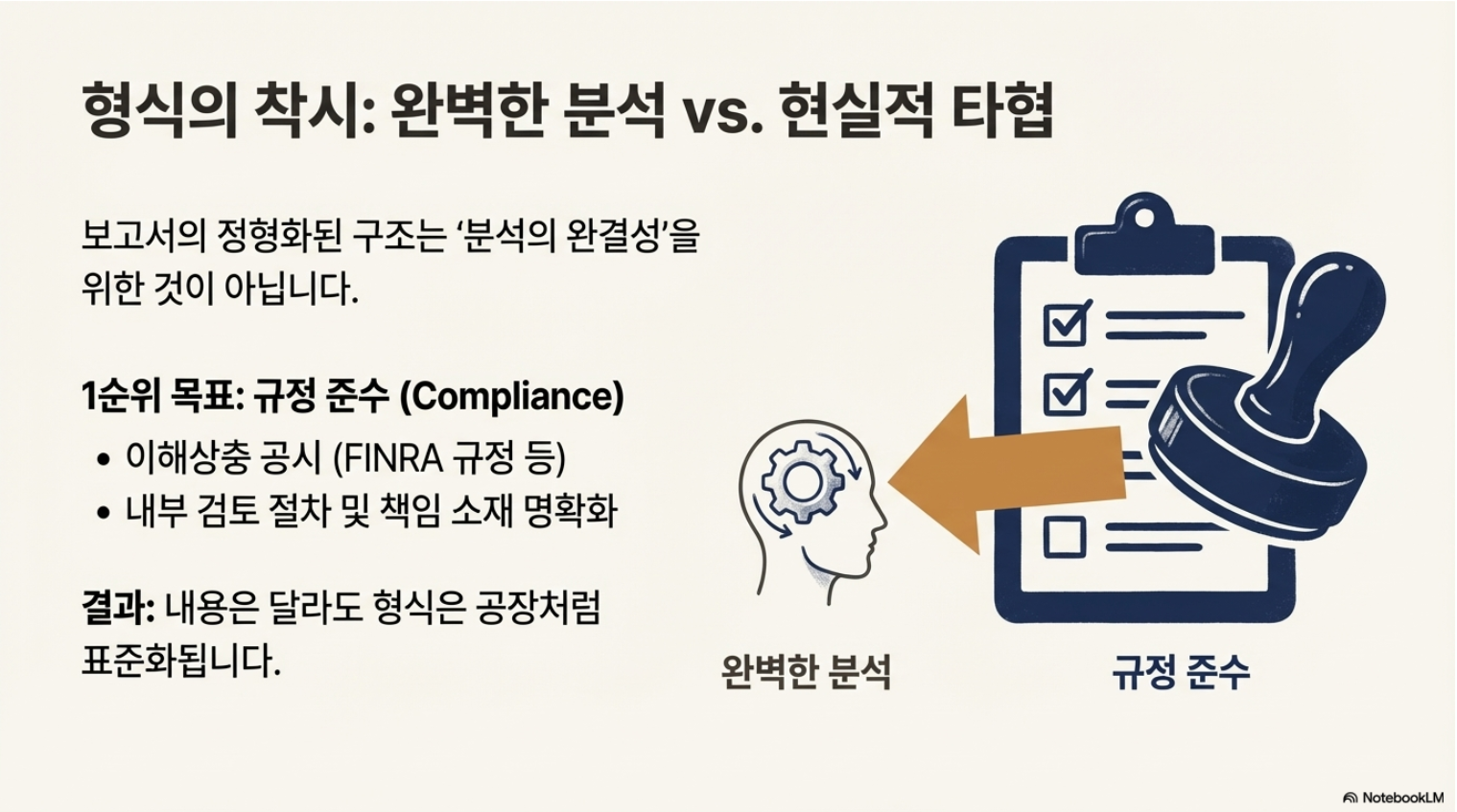 우리가 마주하는 정돈된 보고서 양식은 ‘완벽한 분석’의 필연적 결과물이라기보다, 규정 준수(Compliance)와 업무 효율성을 위한 현실적 타협의 산물인 경우가 빈번합니다.