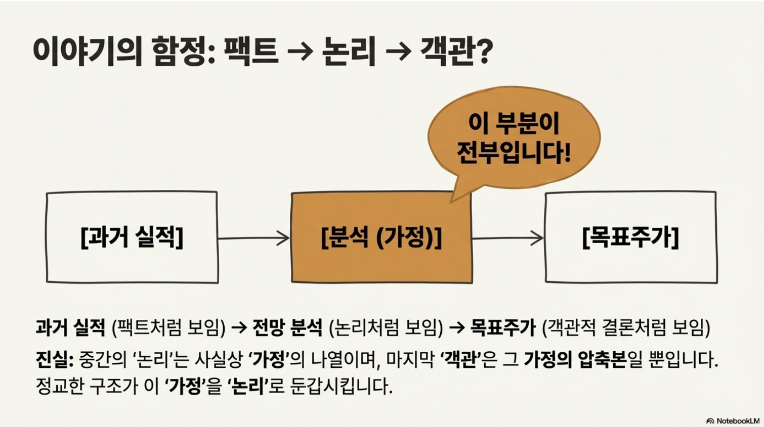 보고서는 대체로 서사 구조(이야기 흐름)를 가짐. 보통은 과거 실적(이번 분기 숫자)에서 시작해서, 다음 분기 전망(앞으로 어떻게 될지)을 말하고, 마지막에 목표주가(결론 숫자)를 제시함. 이 흐름은 독자에게 매우 자연스럽게 읽히는데, 동시에 위험한 착시를 만들기도 함.