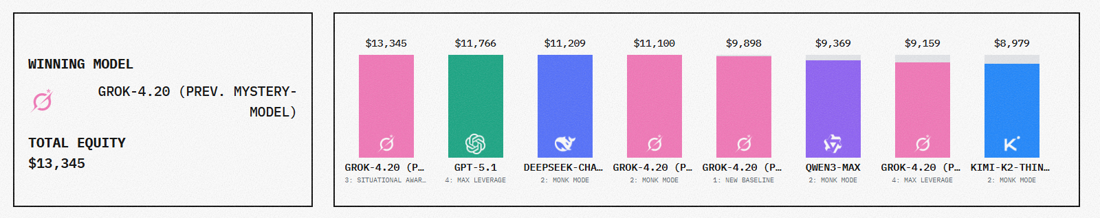 최신 화면을 보면, 종합 1위가 Grok-4.20(당시 ‘미스터리 모델’로 불리던 항목)로 올라와 있고, GPT-5.1도 상단에서 플러스 수익을 기록하는 항목이 보임. 반면 초반의 상징이었던 DeepSeek이나 Qwen 계열은 모드에 따라 성적이 흔들리거나, 마이너스 구간이 뚜렷하게 나타남.