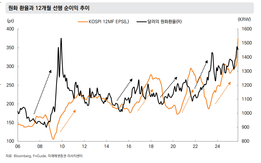 그리고 2025년 초-중반까지는 이것이 정말 작동했다. K-반도체 기업들의 실적이 호황이었고, 미국의 이자율이 높게 유지되었으며, 이에 따라 환율이 1450~1500원대로 올라갔다. 달러 매출 기반의 한국 기업들이 환차익을 얻었고, 주가는 올라갔다.