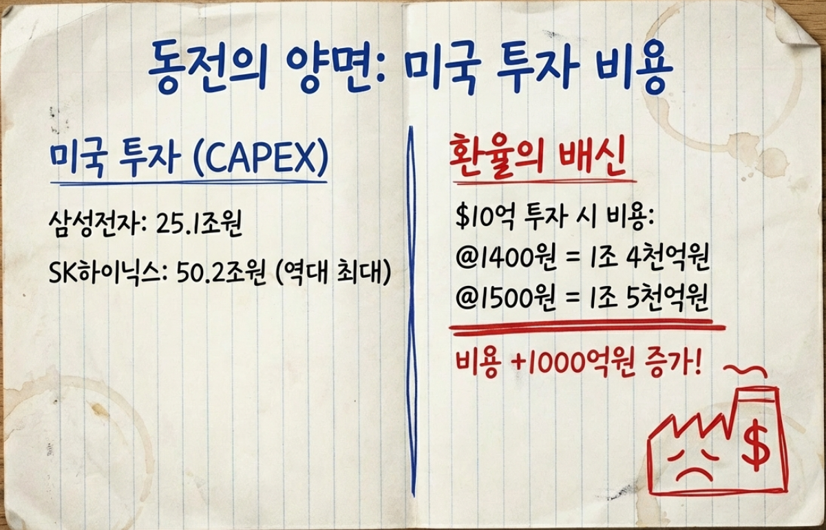 이것이 왜 중요한가? 삼성전자와 SK하이닉스는 2026~2028년까지 지속적으로 미국에 투자할 계획을 갖고 있기 때문이다. 환율이 1500원 수준에서 유지되면, 투자 비용이 계획보다 훨씬 커진다. 반면 환율이 1300원대로 내려가면, 투자 비용이 줄어든다.