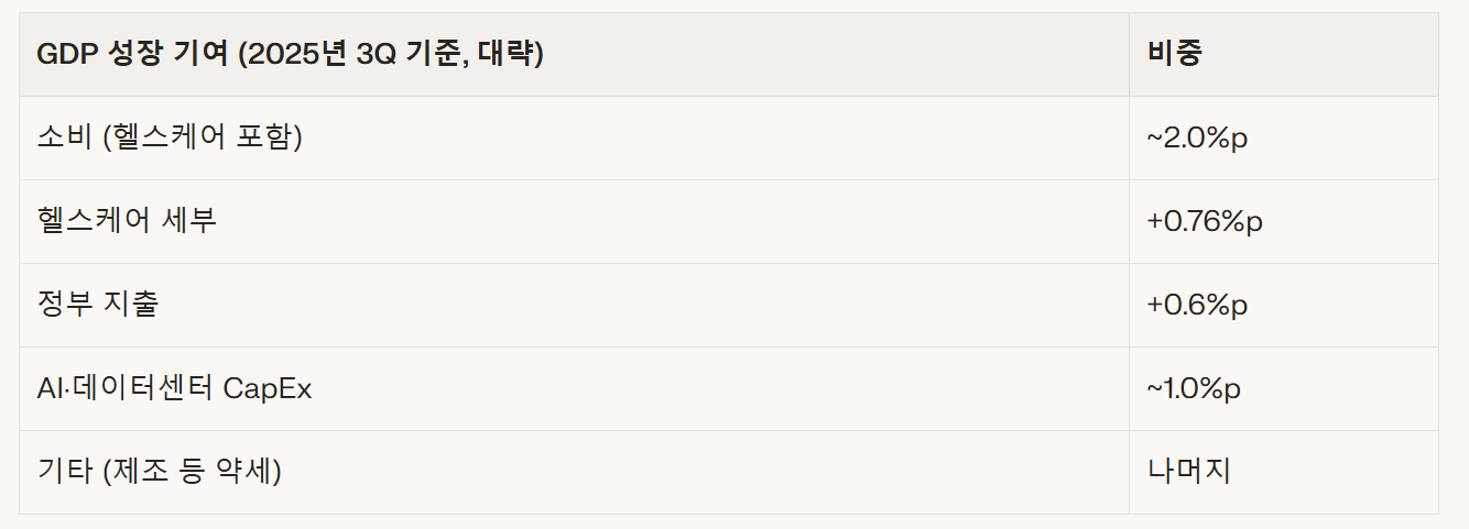 더 심각한 건, 이 성장의 나머지 축을 담당하는 것이 고령화 관련 헬스케어 지출과 정부 재정 지출뿐이라는 점이다. 민간 소비나 제조 생산이 늘어나는 게 아니라, 아픈 노인이 늘어서 병원비가 많이 나가고, 정부가 빚을 내서 돈을 뿌리니까 숫자가 올라가는 것일 뿐인 것이다. 이걸 두고 경제가 좋다고 말하는 건, 암 환자가 병원비 많이 쓴다고 "GDP 기여도가 높으니 건강하다"고 말하는 것과 다를 바 없다.