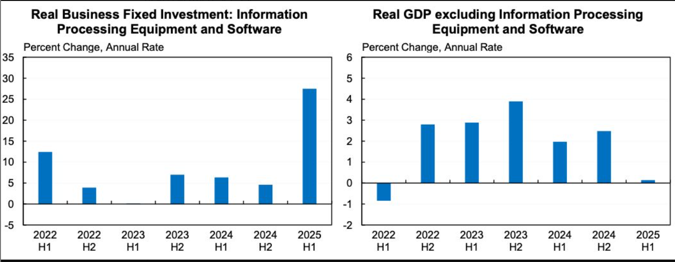 하지만 최근 분석에 따르면, AI 데이터센터 건설과 관련된 자본 지출(Capex)을 제외하면 실질 GDP 성장률은 0%에 수렴한다. 즉, 지금의 성장은 물건을 많이 팔거나 소비가 늘어서 생긴 '건강한 성장'이 아니라, 빅테크 기업들이 그래픽카드를 사고 서버실을 짓는 돈만으로 부풀려진 '거품 성장'이라는 뜻이다.