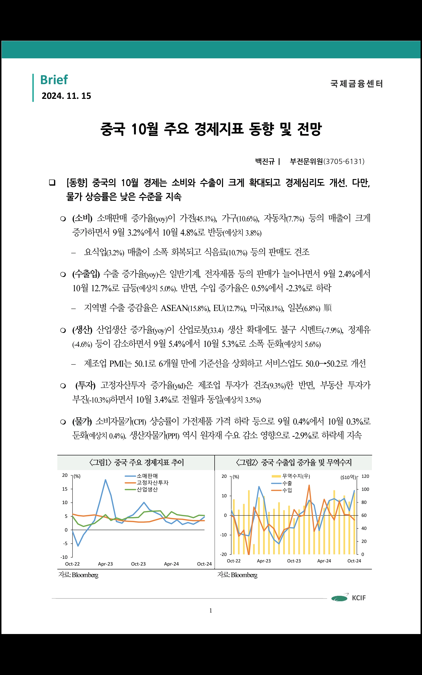 중국 10월 주요 경제지표 동향 및 전망 ('24.11.15 국제금융센터)