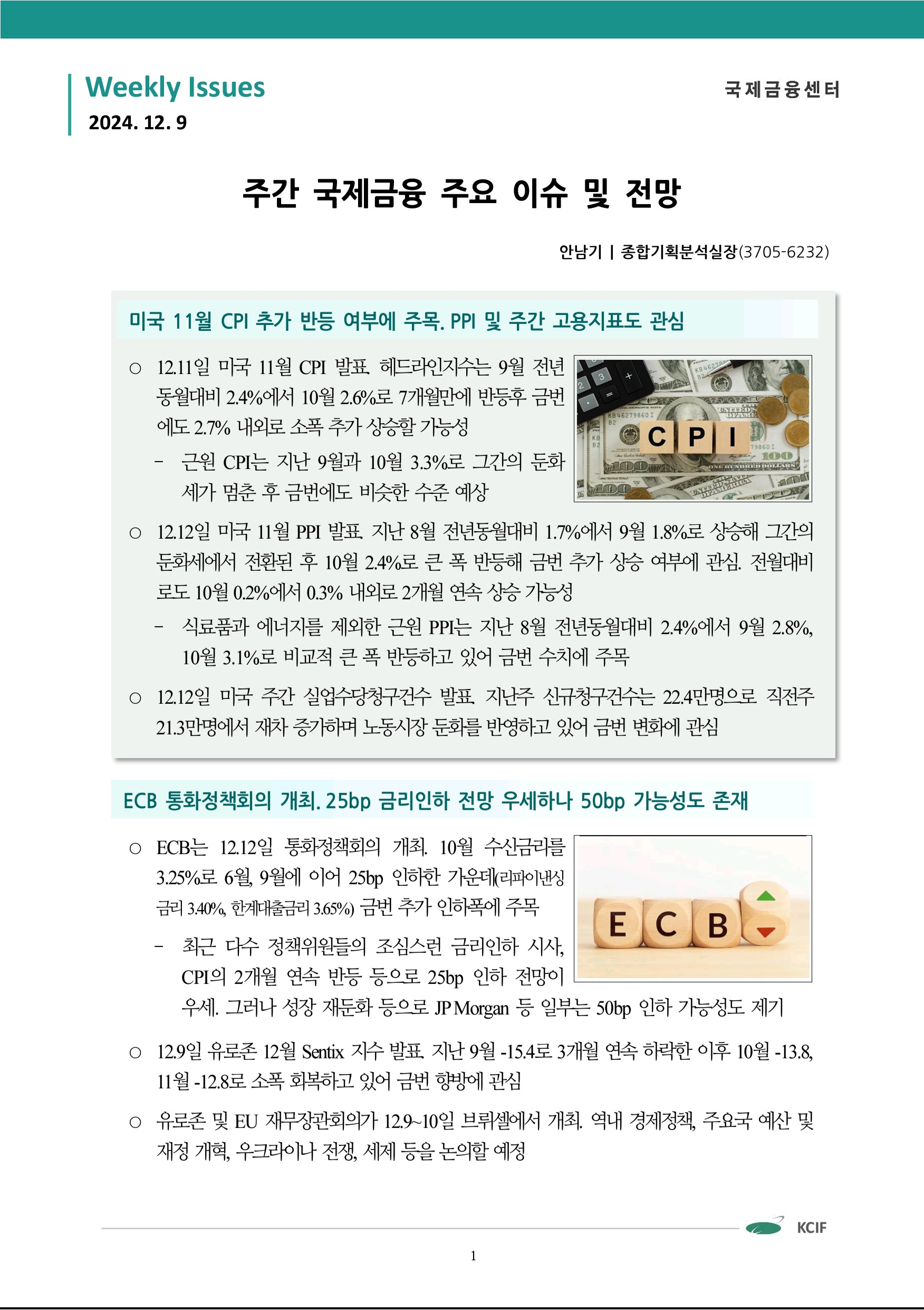 주간 국제금융 주요 이슈 및 전망 ('24.12.9 국제금융센터)