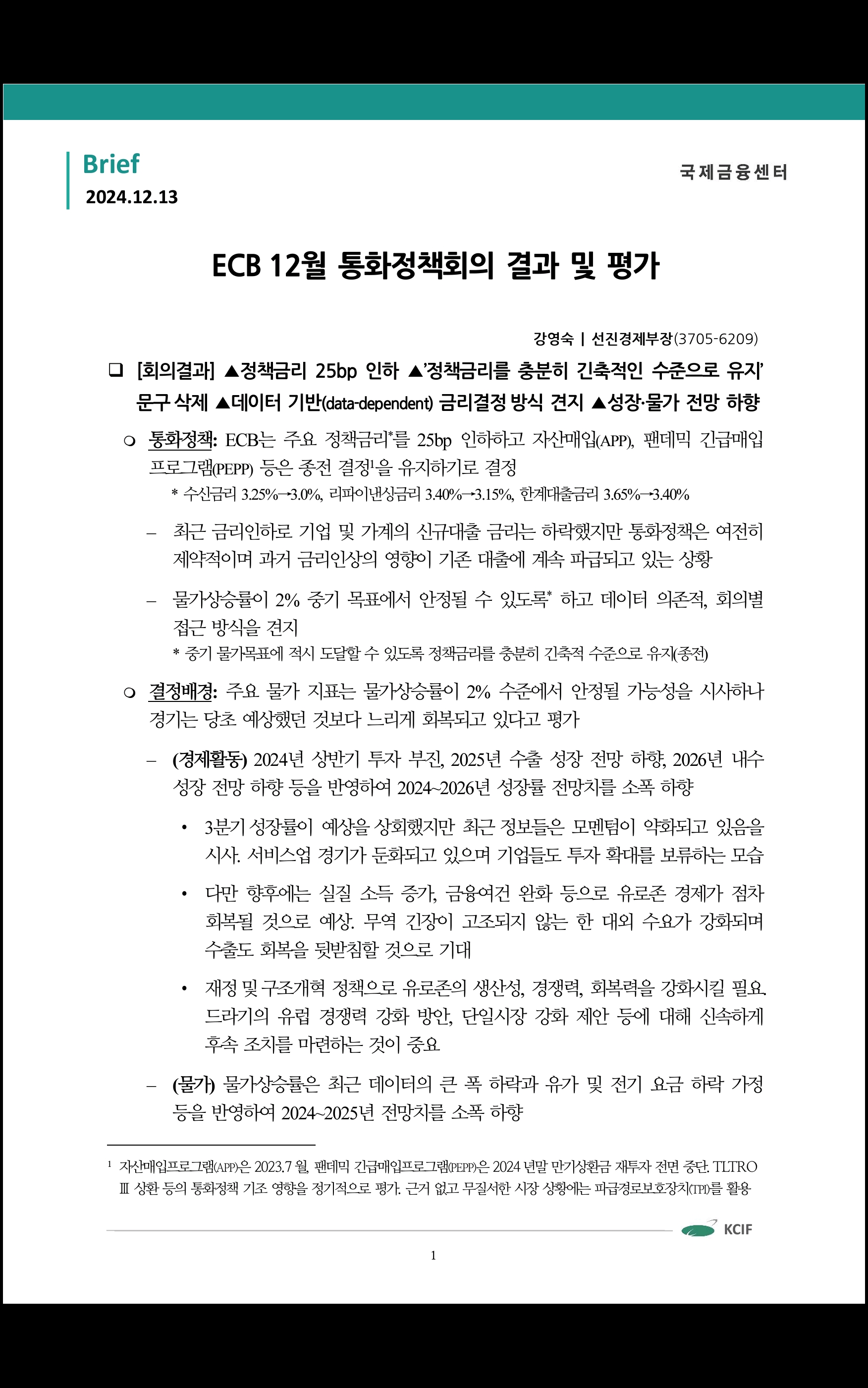 ECB 12월 통화정책회의 결과 및 평가 ('24.12.13 국제금융센터)