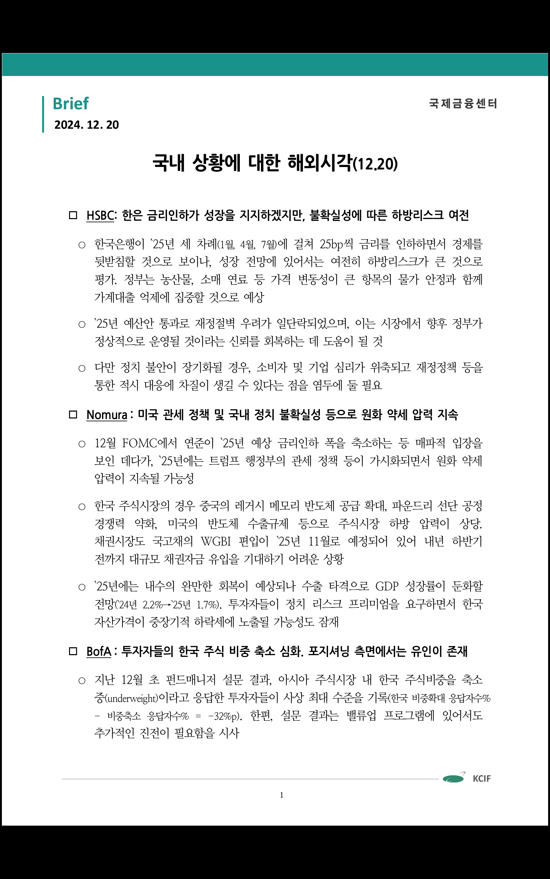 국내 상황에 대한 해외시각 ('24.12.20 국제금융센터)