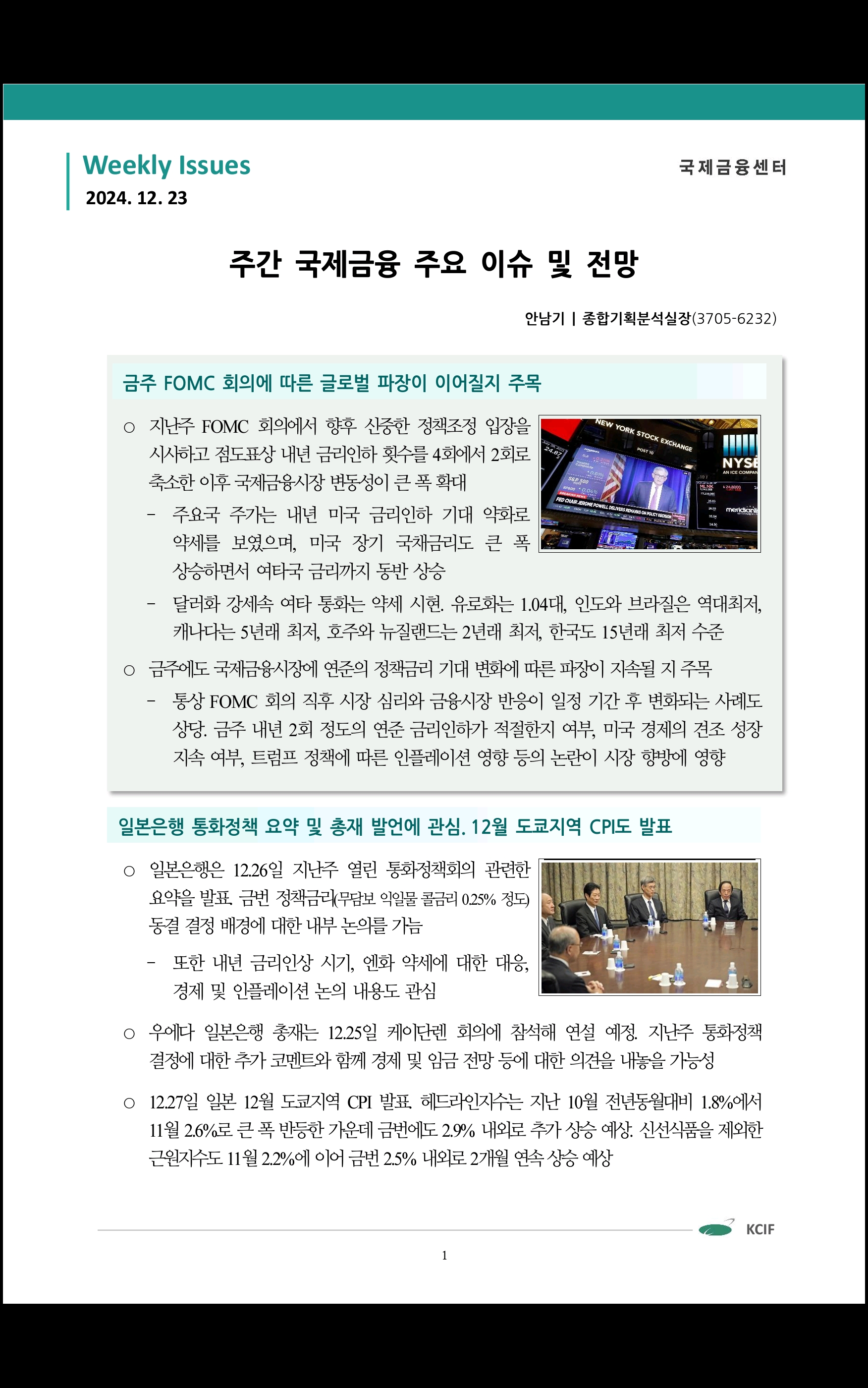 주간 국제금융 주요 이슈 및 전망 ('24.12.23 국제금융센터)