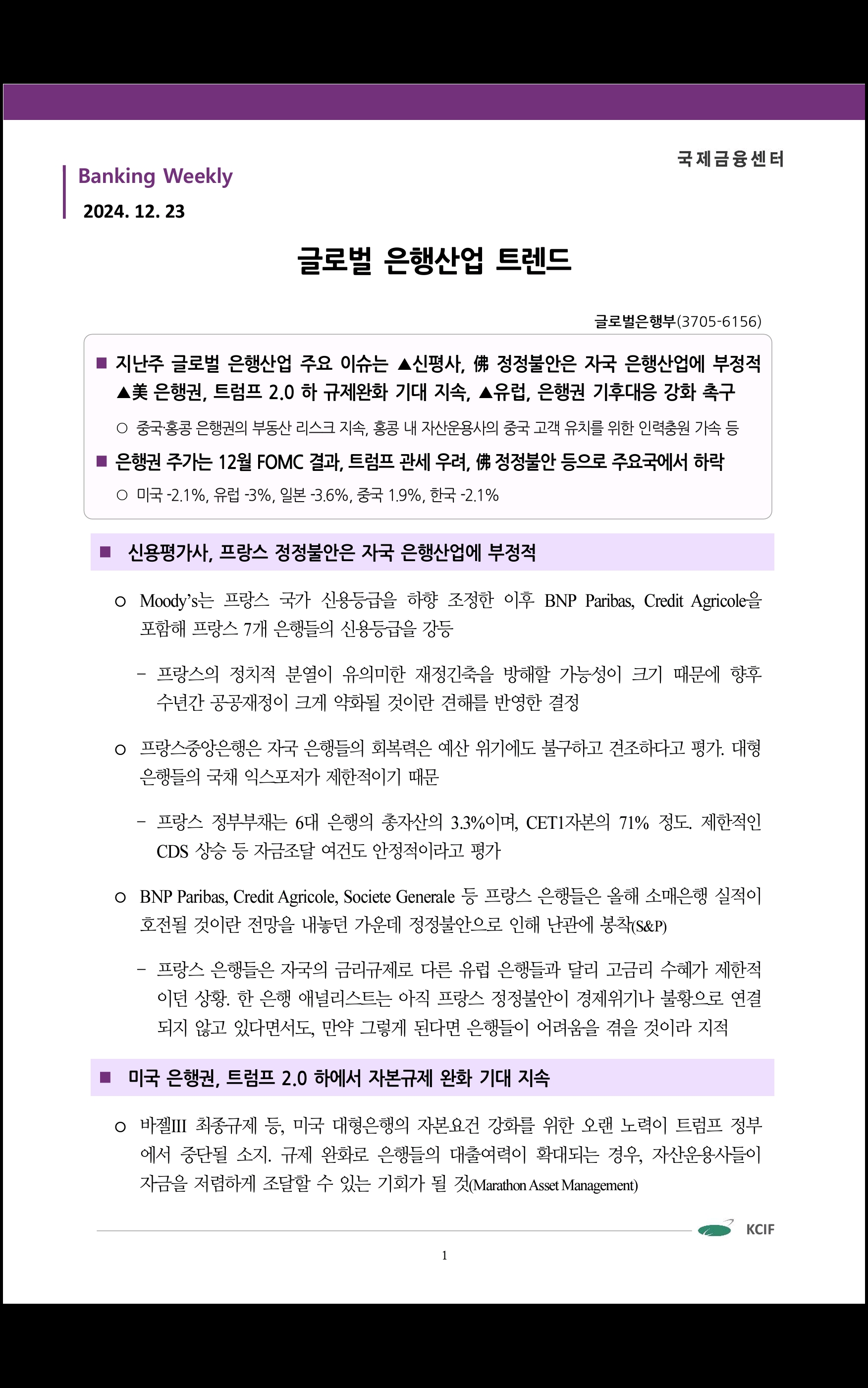 글로벌 은행산업 트렌드 ('24.12.23 국제금융센터)
