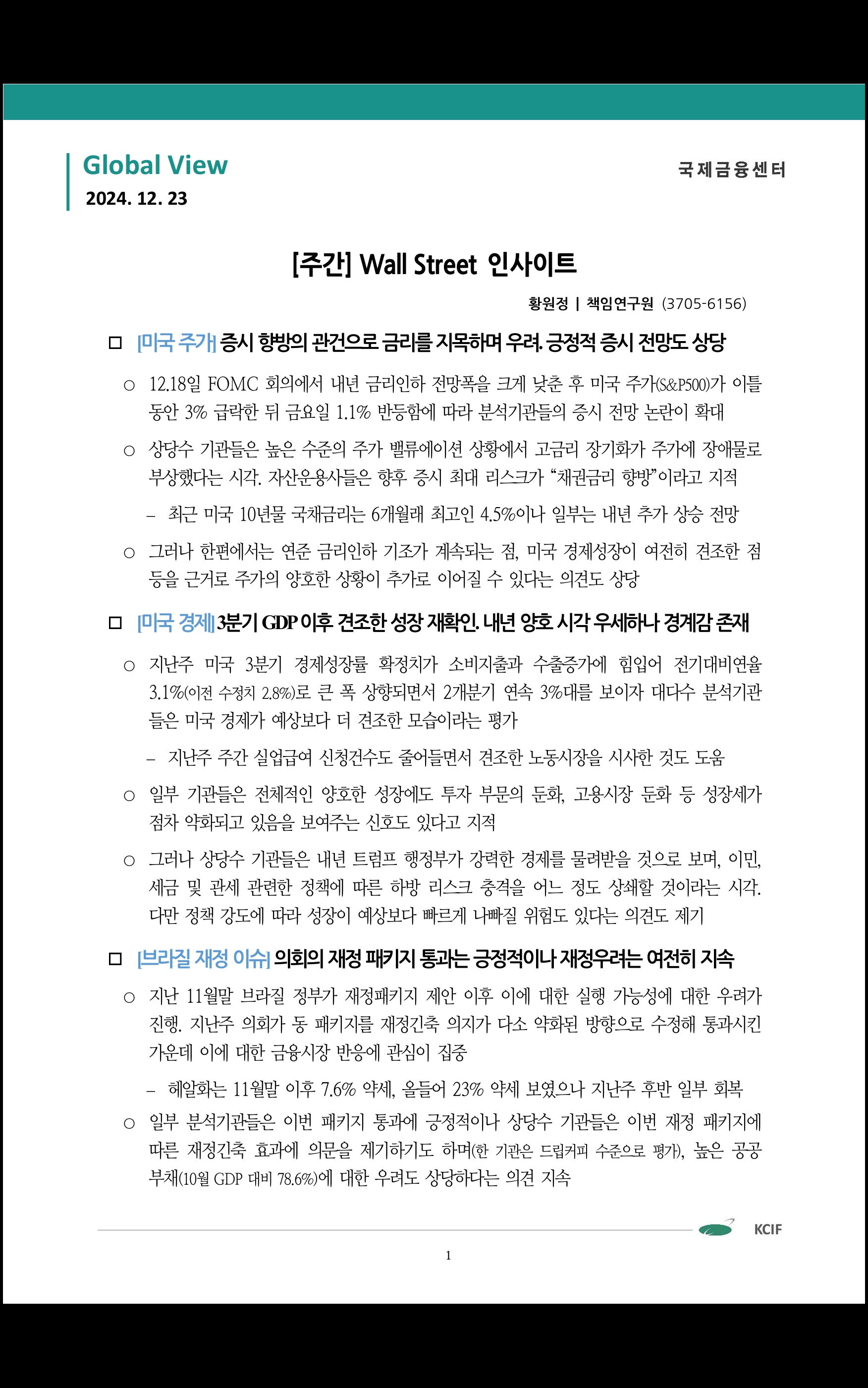 [주간] Wall Street 인사이트 ('24.12.23 국제금융센터)
