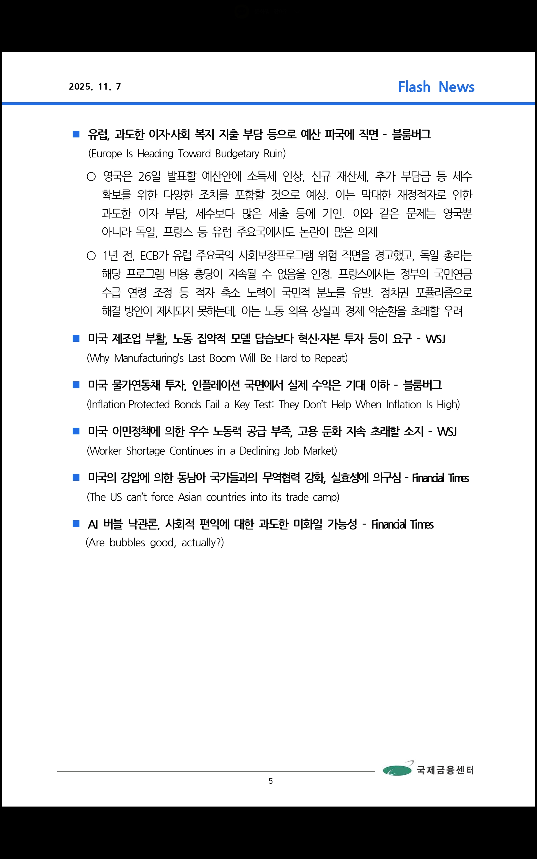 데일리 브리핑 ('25.11.5 국제금융센터)