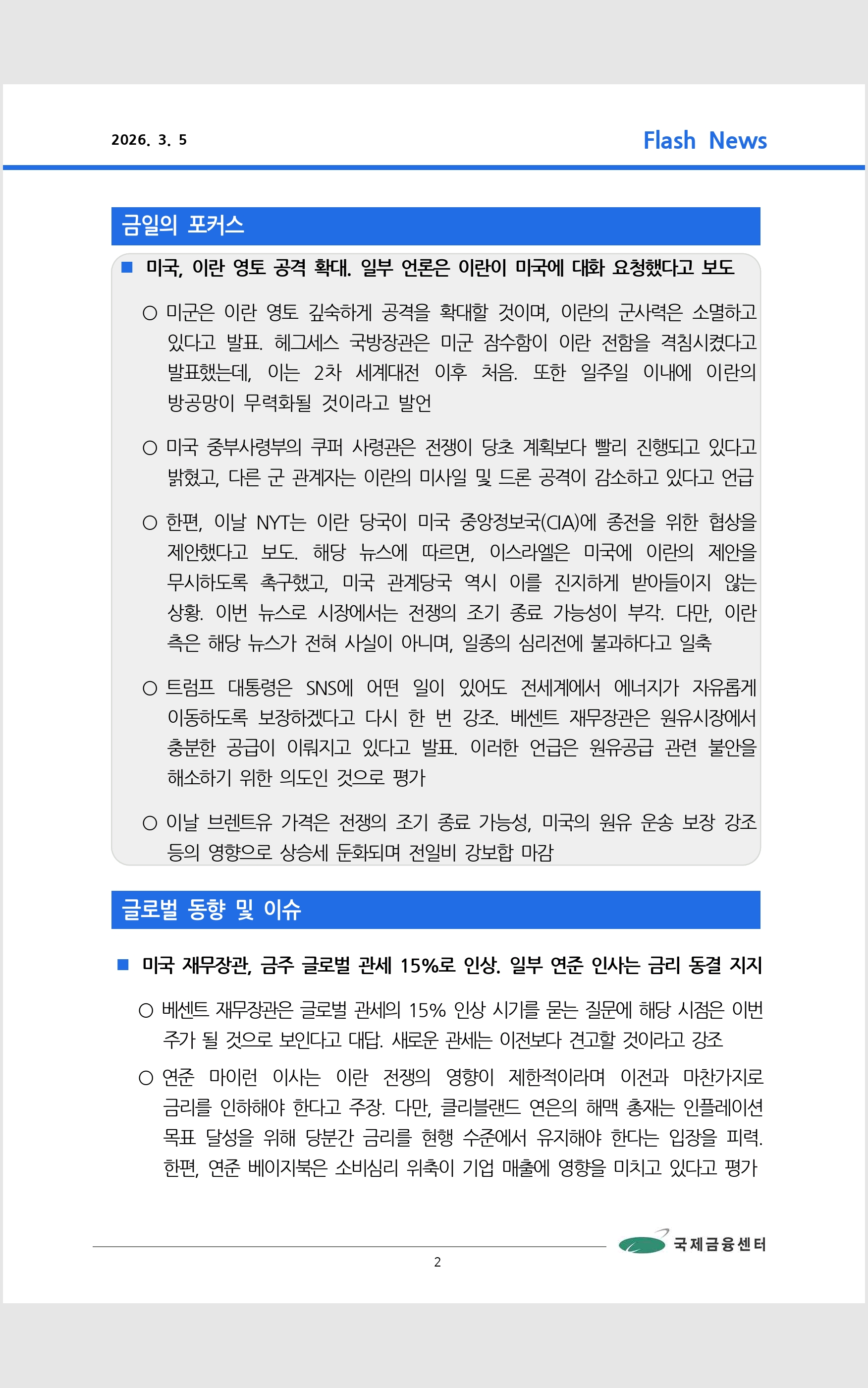 데일리 브리핑 ('26.3.2 국제금융센터)