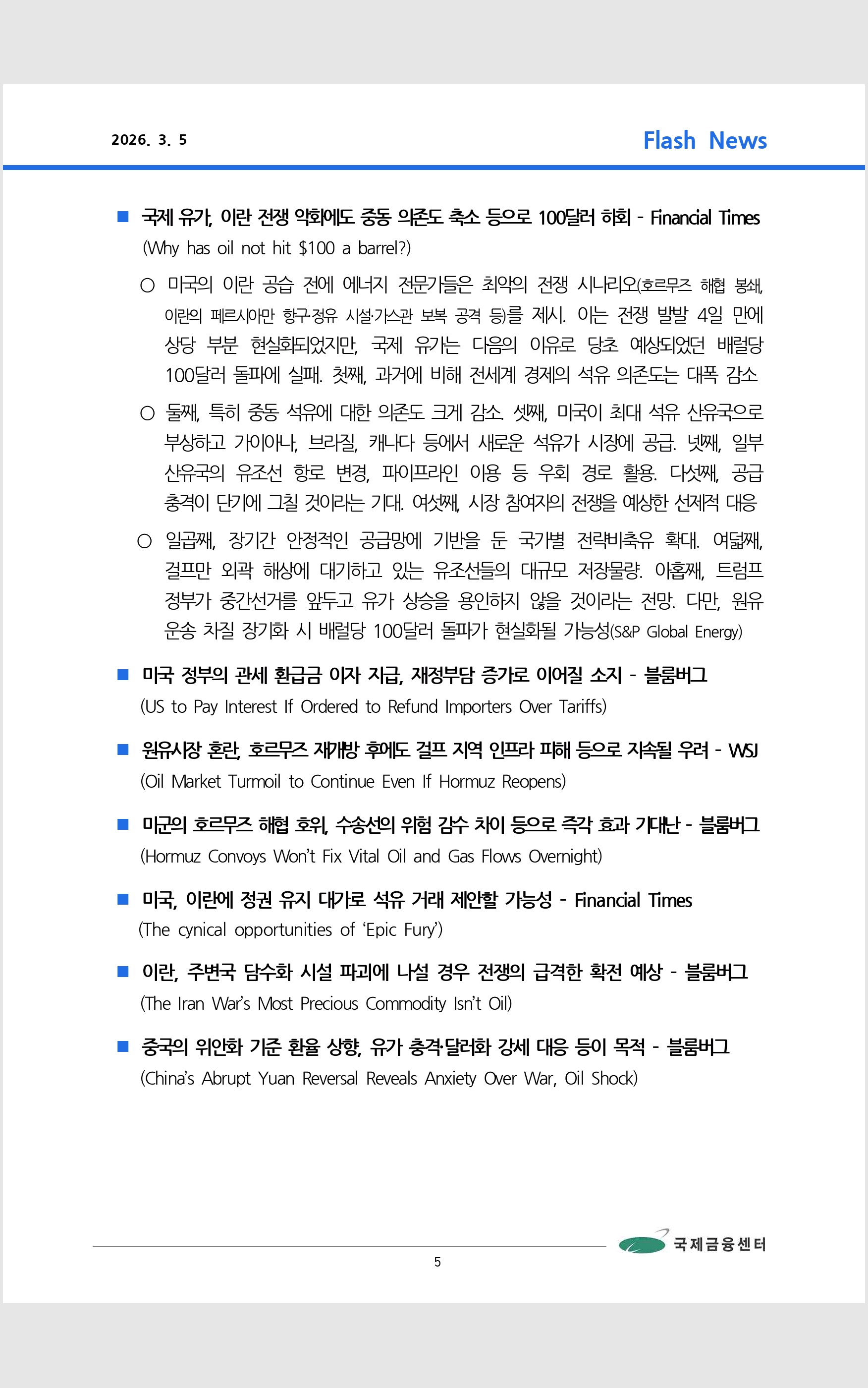 데일리 브리핑 ('26.3.5 국제금융센터)
