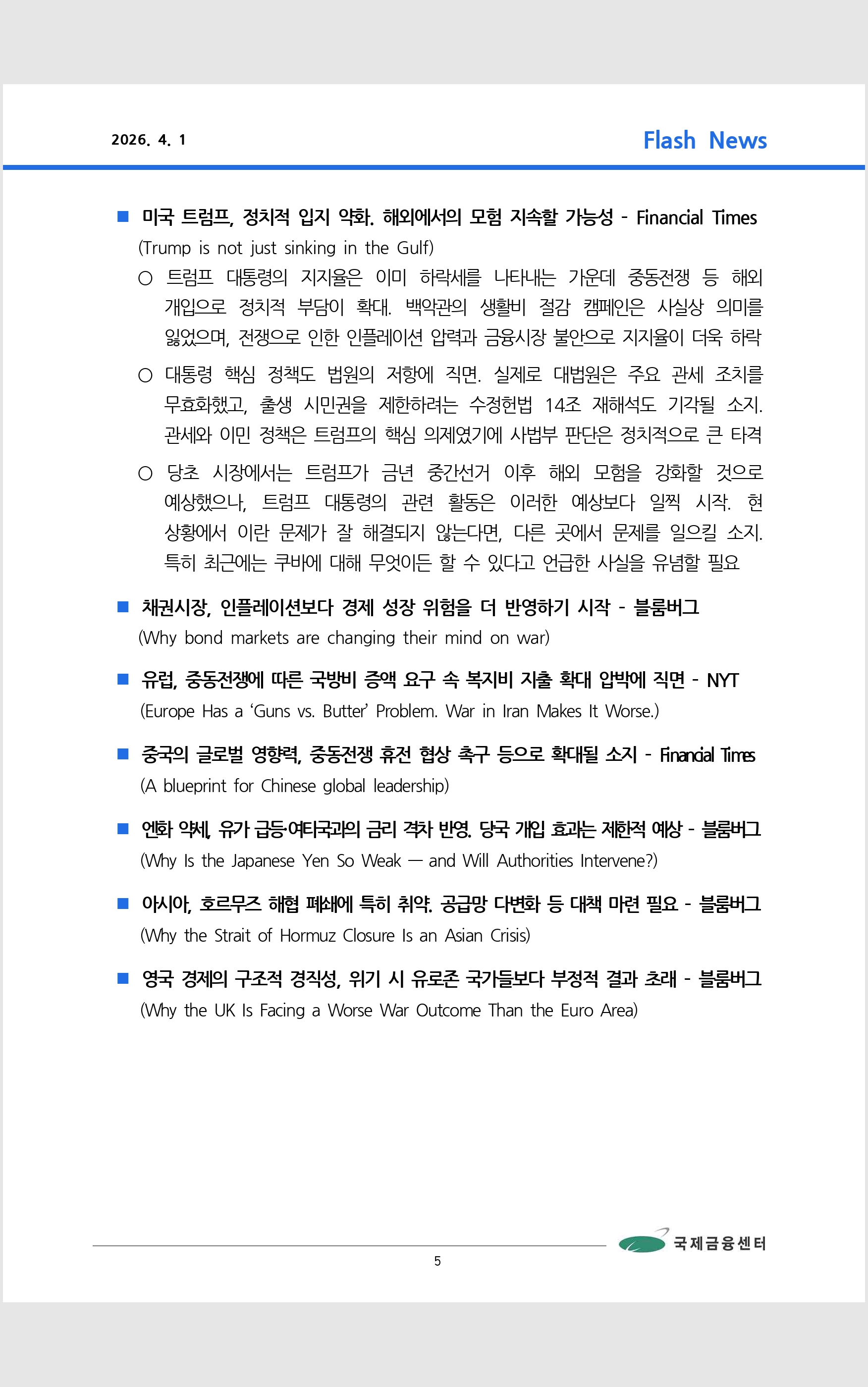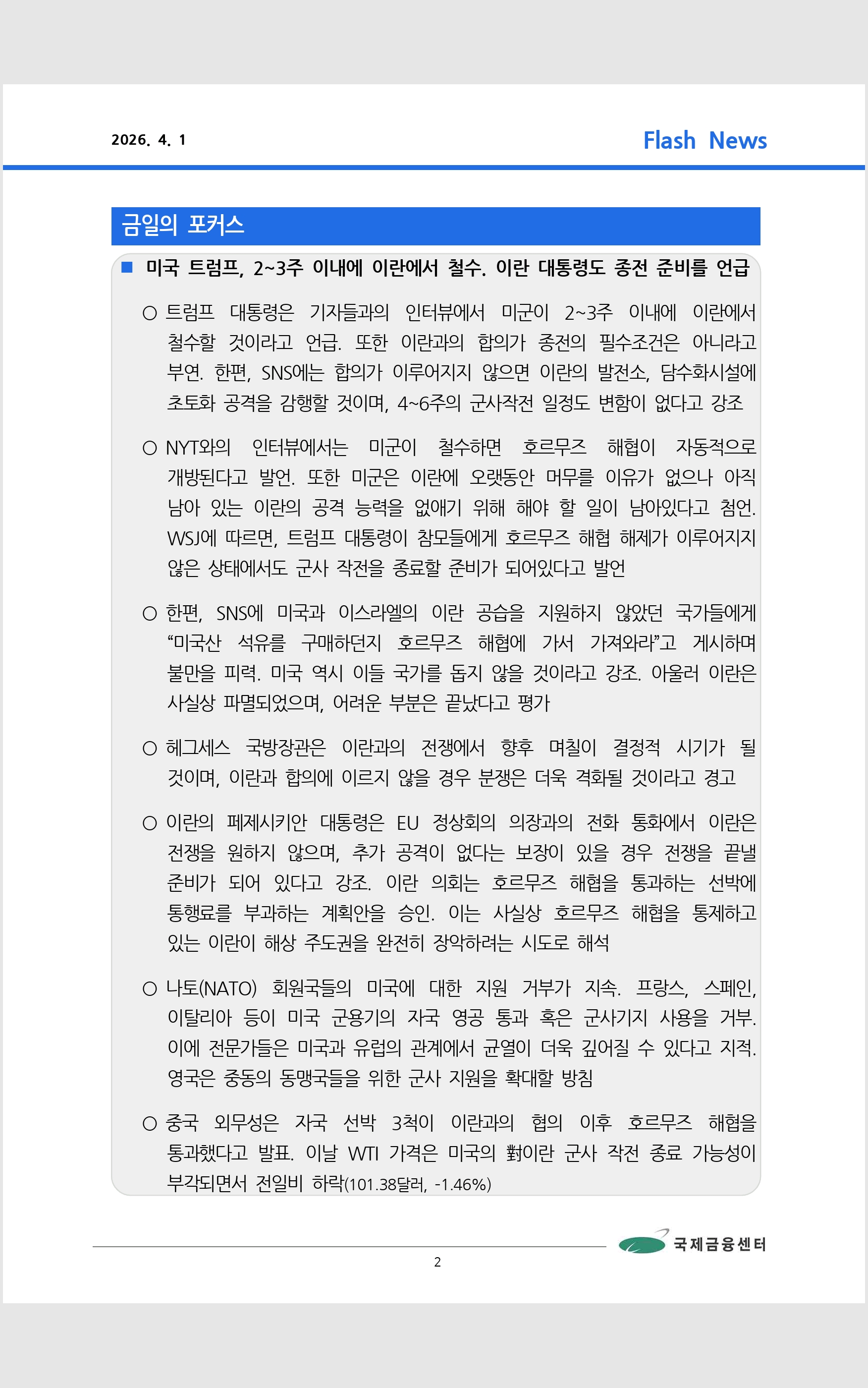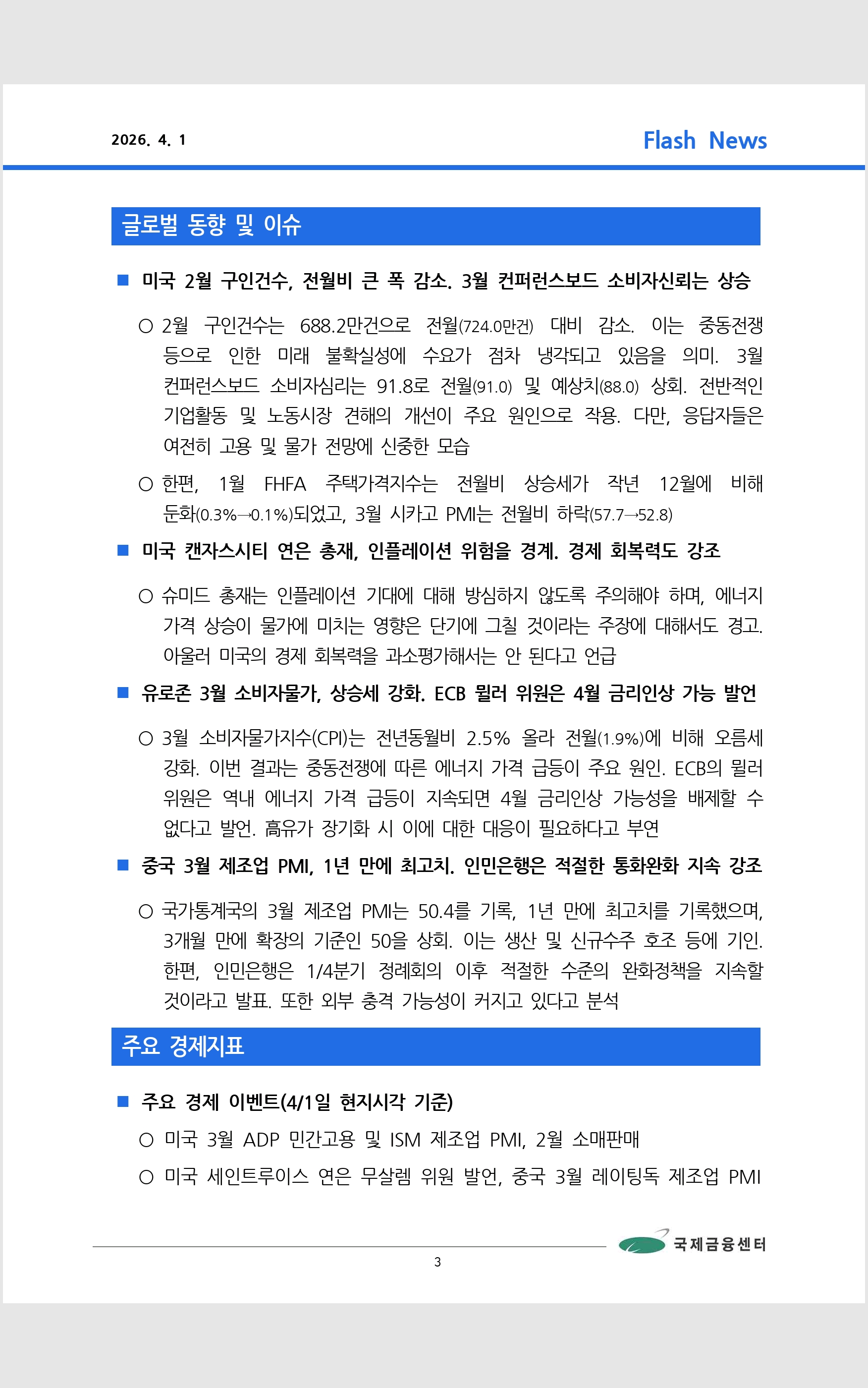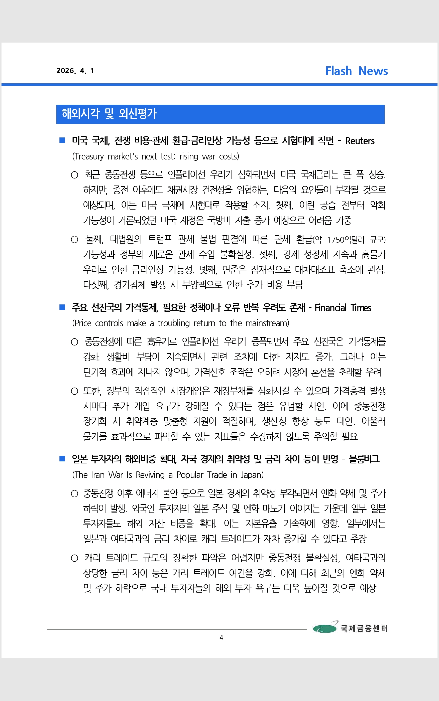 데일리 브리핑 ('26.4.1 국제금융센터)