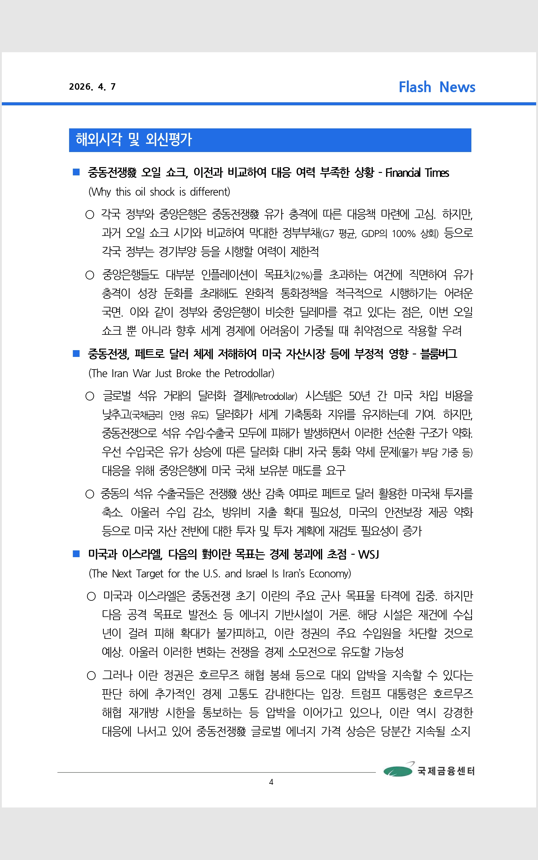 데일리 브리핑 ('26.4.4 국제금융센터)