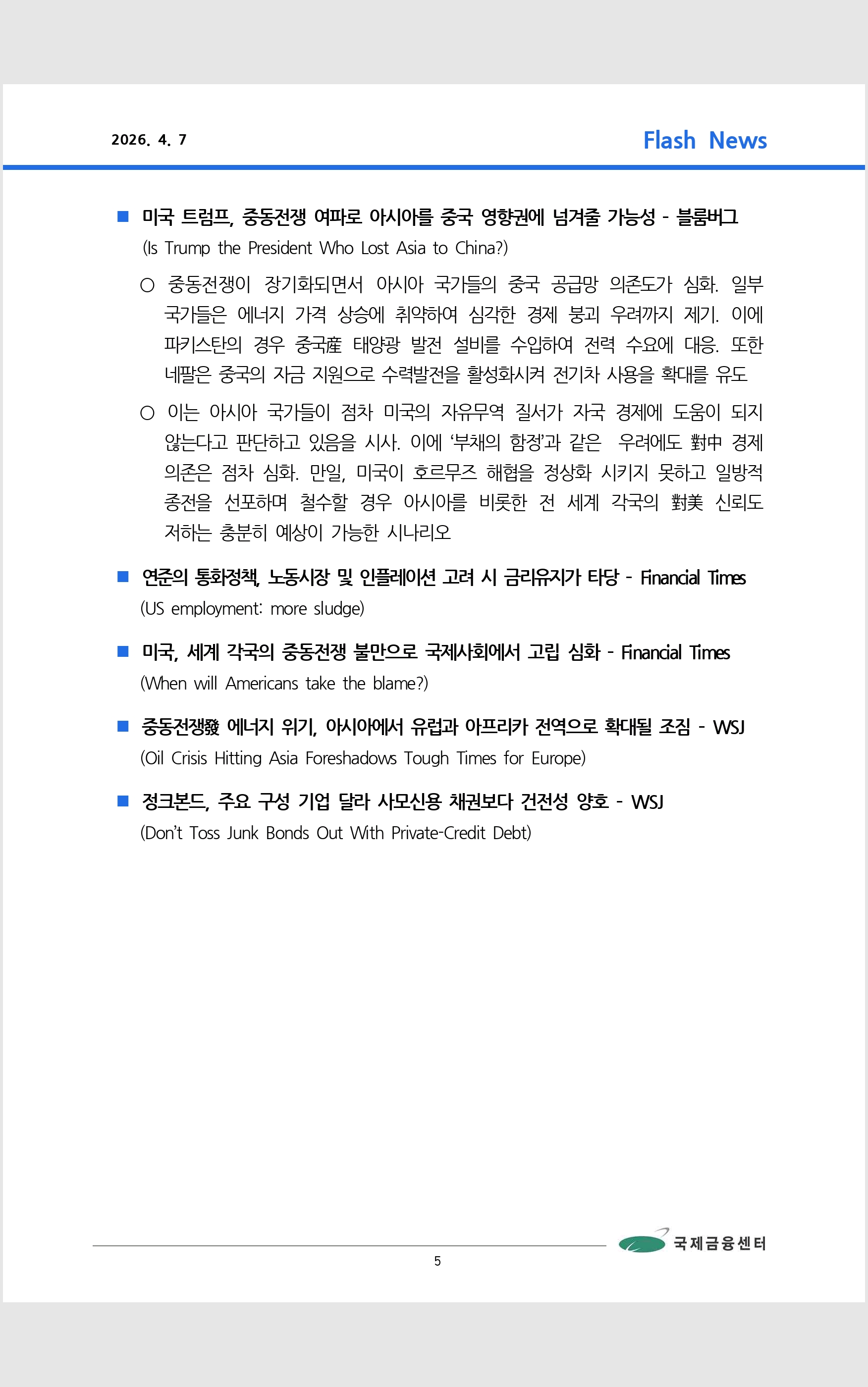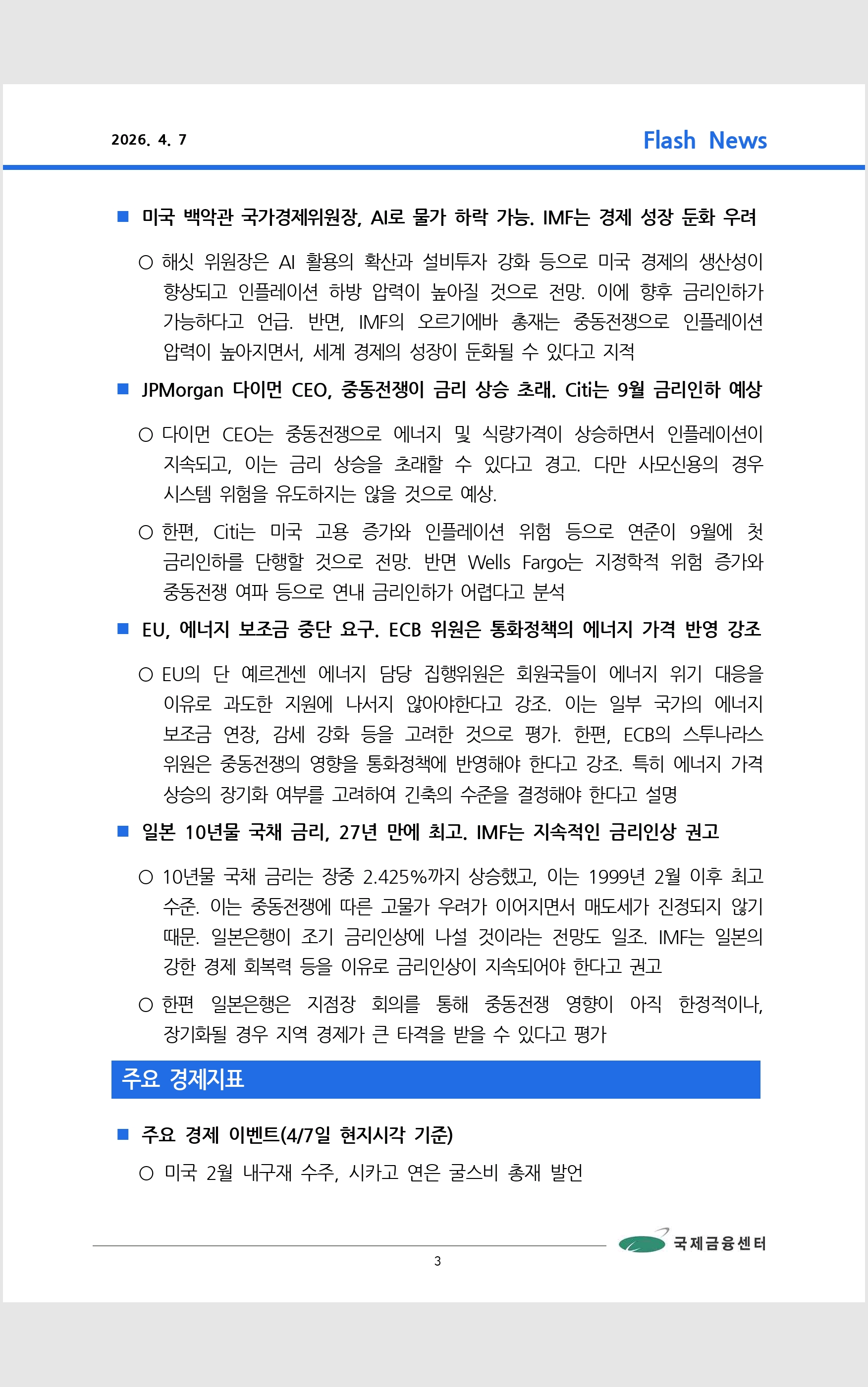 데일리 브리핑 ('26.4.7 국제금융센터)