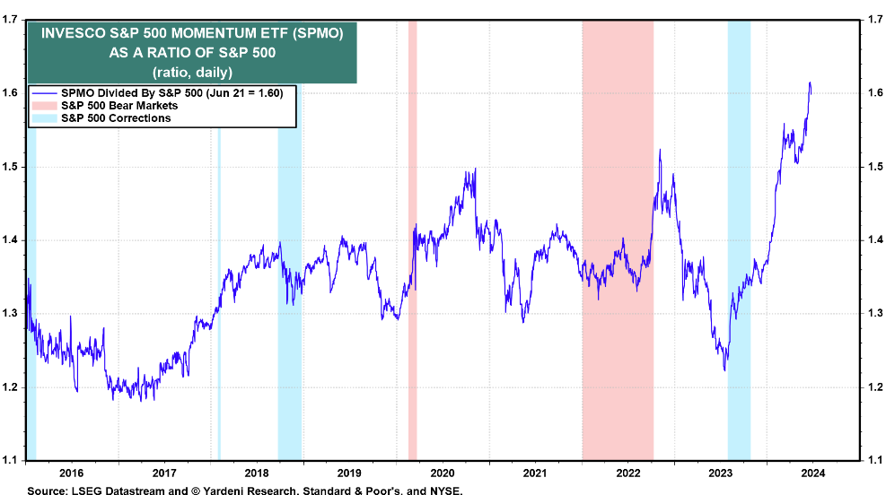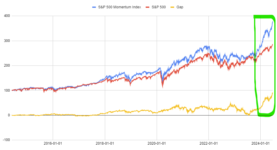 위 차트의 파란선이 23년 하반기부터 급상승했다는 말은, 23년 하반기 이후부터 SPMO가 S&P500에 비해 수익률이 압도적으로 높았다는 겁니다. 어쩌면 23년 하반기부터 S&P500을 지배한 테마는 AI 혹은 빅테크라기보다 '모멘텀' 이라고 할 수도 있지 않을까요?