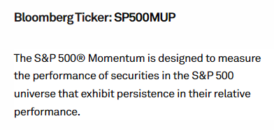 공식설명을 보면 S&P500 모멘텀 지수는 S&P500 상장기업 중 상대적으로 꾸준하게 더 나은 수익률을 내는 종목들로 구성한 지수라고 되어 있습니다. 즉, 상대 수익률이 높은 종목들로 만든 지수죠. 이 지수를 추종하는 ETF가 SPMO입니다.