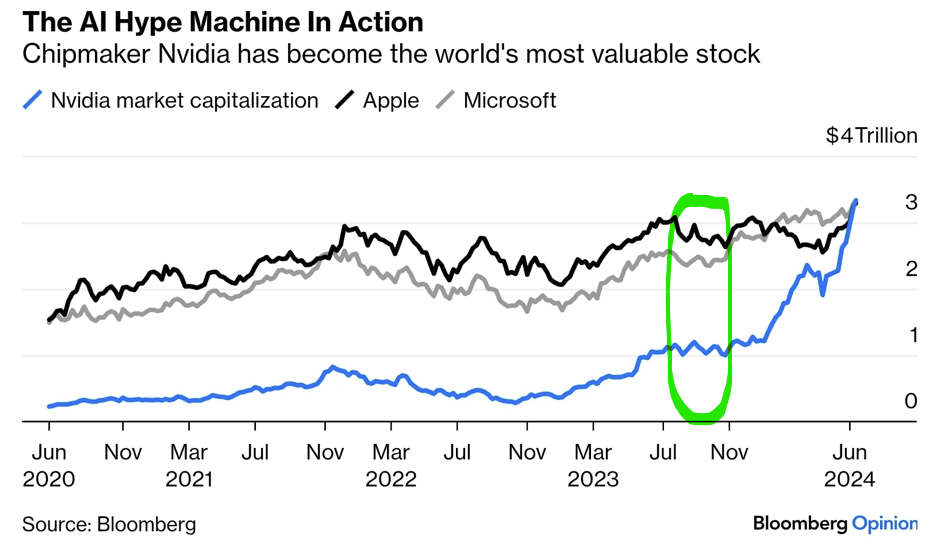 맨 처음 차트를 다시 봐도 대략 감이 옵니다. 녹색 형광펜 구간이 S&P500이 조정을 겪었던 23년 8~11월 구간입니다. 그 구간에서 NVDA, MSFT는 거의 조정을 받지 않았죠. 반면, AI가 덜 묻은 빅테크였던 AAPL은 조정을 크게 겪었구요.