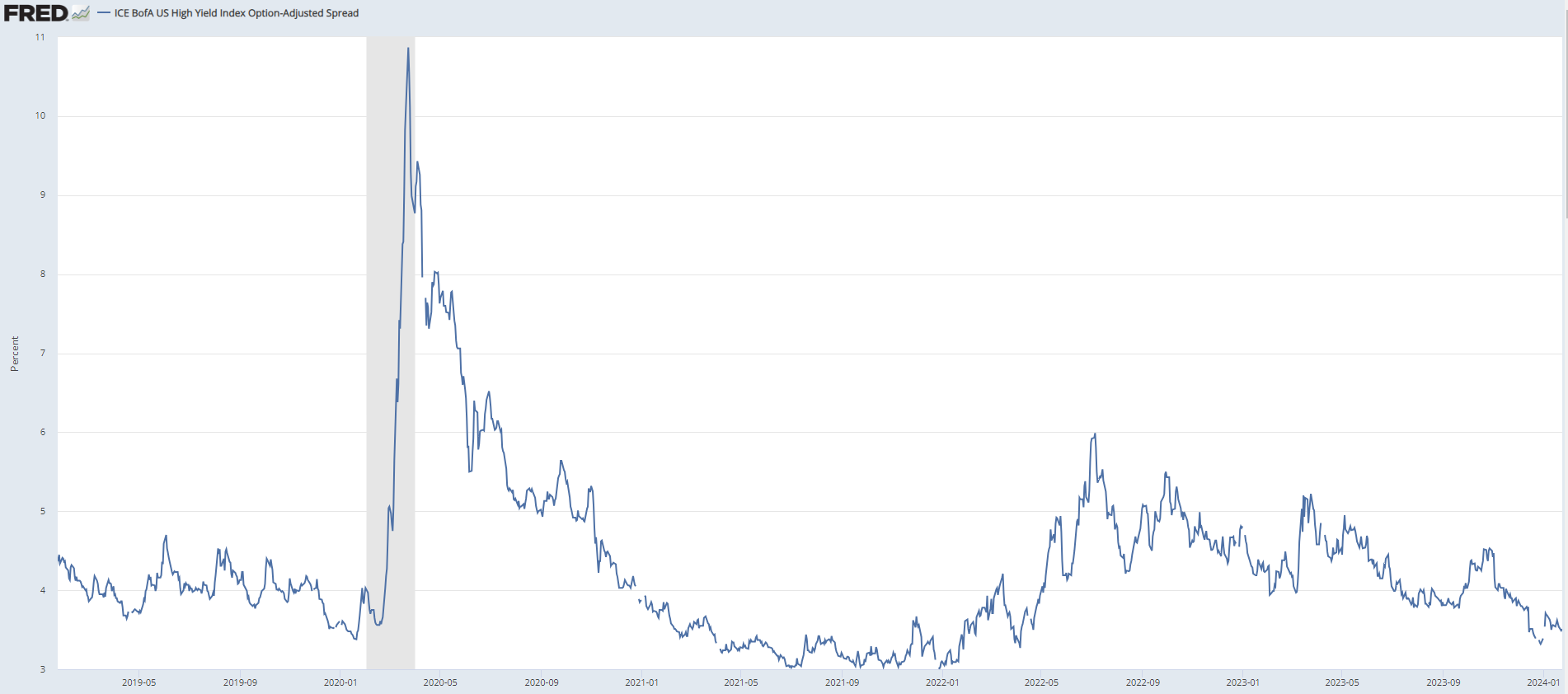 다음은 하이일드 스프레드입니다. 신용도가 낮은 기업의 회사채 금리와 가장 신용도가 높은 미국 국채 금리차를 의미합니다. 하이일드 스프레드 역시 경기침체가 임박했음을 알려주는 좋은 지표입니다.