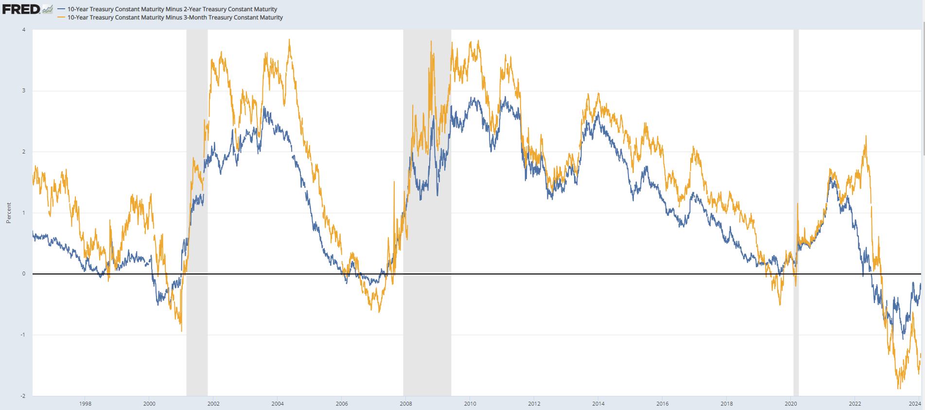 장단기 금리차는 자주 들어보셨을 겁니다. 파란선은 미국채 10년물과 2년물의 금리차, 노란선은 10년물과 3개월물의 금리차입니다. 한국의 장단기 금리차는 아래 링크를 참조하시면 됩니다.