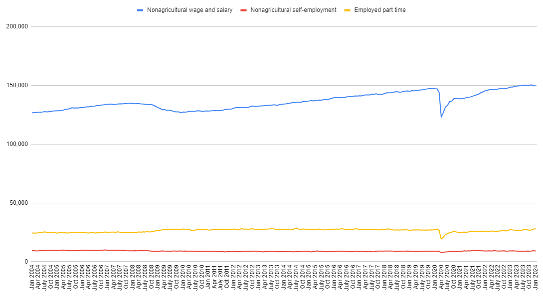 풀타임은 감소, 파트타임 취업자 수는 그보다 크게 늘었습니다. 파트타임으로 멀티잡을 뛰는 사람의 수가 늘었다고 추론이 가능하겠죠.