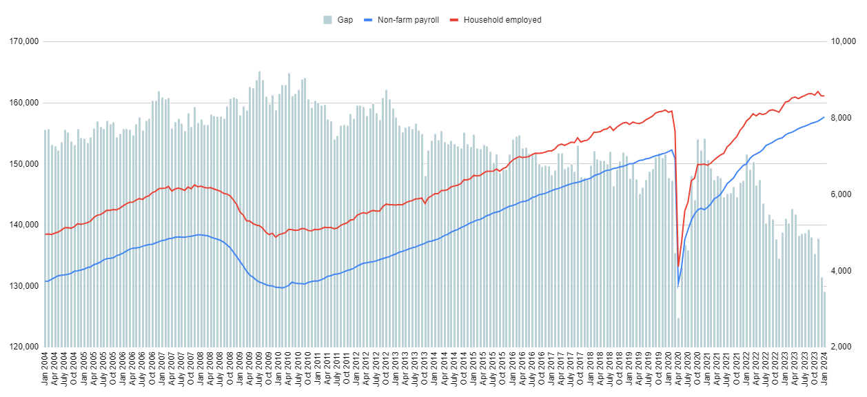 위 차트는 non-farm payroll (일자리 수) 과 Household employed (취업자 수), 그리고 그 둘 간의 스프레드를 그렸습니다. 파란선이 NFP, 빨간선이 취업자 수, 연녹색 막대가 둘 간의 스프레드입니다.