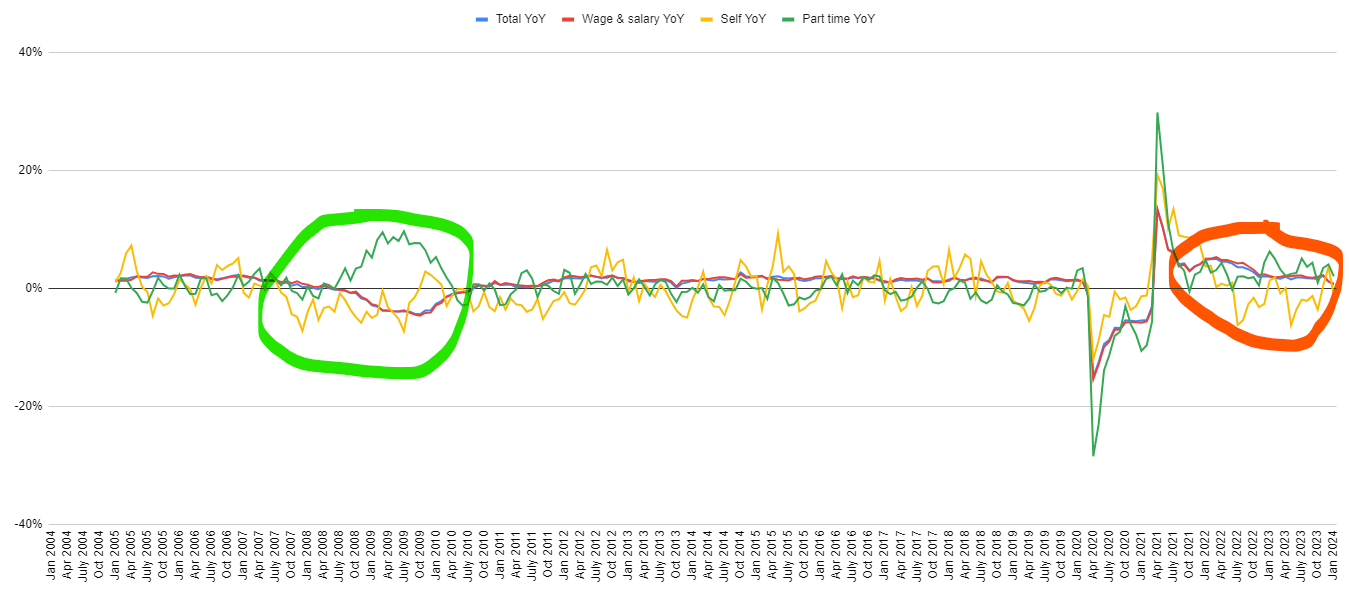 같은 차트를 YoY 상승률로 바꿔서 보면 위와 같이 됩니다. 가장 우측의 주황 형광펜으로 마킹한 구간의 초록선을 보면 팬데믹 이후 파트타임 취업자 수 YoY 상승률이 계속해서 플러스 상태를 유지하고 ...