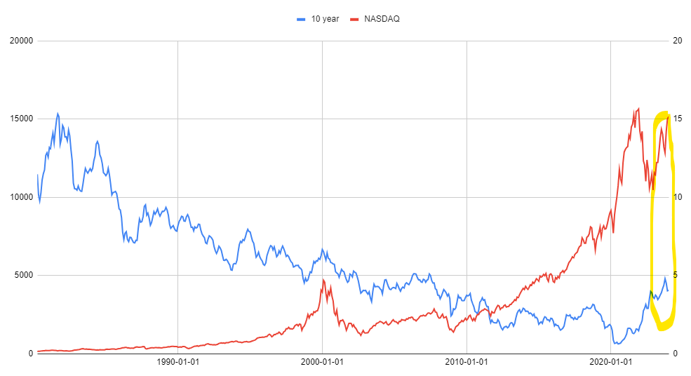 1980년부터 지금까지 10년물 국채 금리 (파란선) 와 나스닥 종합지수 (빨간선) 의 추이입니다. 닉슨 대통령이 달러의 금태환 정책을 포기한 여파로 폴 볼커가 극단적인 금리인상을 시행한 이후부터 미국의 10년물 금리는 보시는 바와 같이 우하향 일변도였습니다. 그리고, 나스닥 지수는 반대로 우상향 일변도이죠. 긴 추세로 보면 10년물 국채 금리와 나스닥 지수는 역의 상관관계를 가진다고 할 수 있습니다.