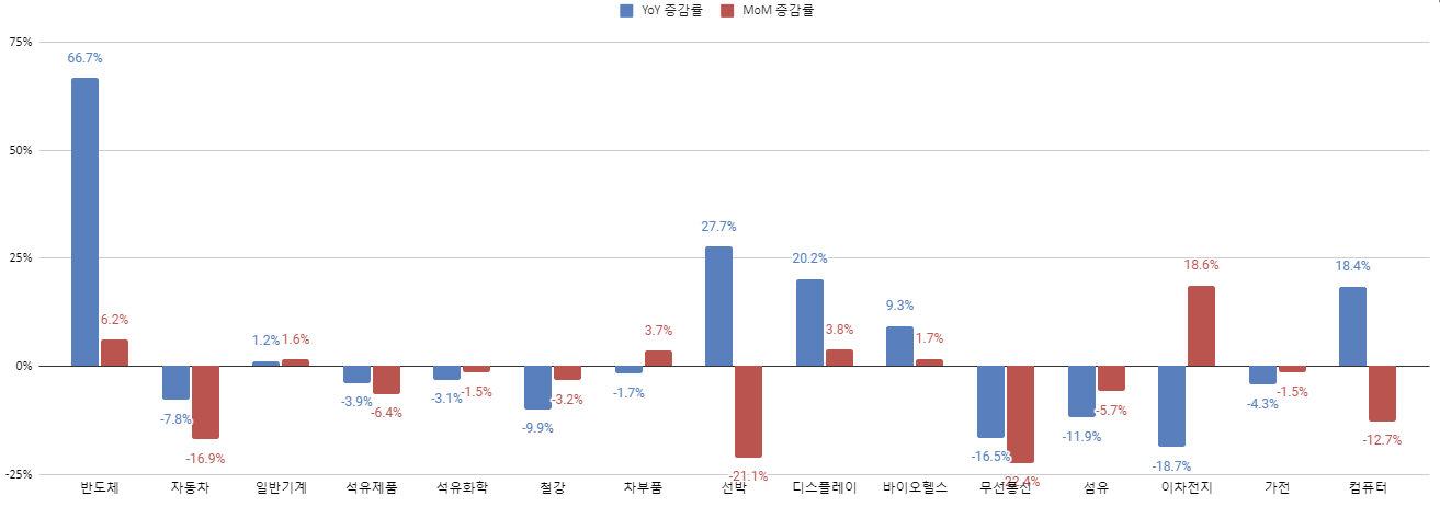 품목 별 총 수출 증가율입니다. 앞서 언급한 것처럼 총 수출은 적은 조업일 수로 인해 감소했다고 했죠? 전체 수출금액이 감소했는데도 YoY (파란색), MoM (빨간색) 으로 모두 증가했다면 상당히 선전했다고 볼 수 있겠습니다.