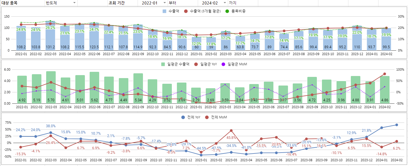 반도체 품목을 자세히 보죠. 가장 상단은 총 수출액 추이입니다. 조업일 수 부족으로 전체 수출액이 2월에 감소했지만 반도체 전체 수출액은 늘었습니다. 중단은 반도체의 일평균 수출액인데 당연히 훨씬 크게 늘었죠. 하단의 YoY 상승률 (파란선) 은 이어지고 있고, MoM 상승률 (빨간선) 도 플러스권입니다.
