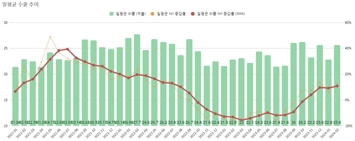 조업일 변수를 제외한 일평균 수출액 추이입니다. 보시다시피 총 수출은 줄었지만 일평균 수출은 크게 늘어난 것이 보이죠. 빨간선 3개월 이동평균 역시 상승했습니다. 1월의 부진했던 결과에서 다시 회복하는 모습을 보여주고 있습니다.